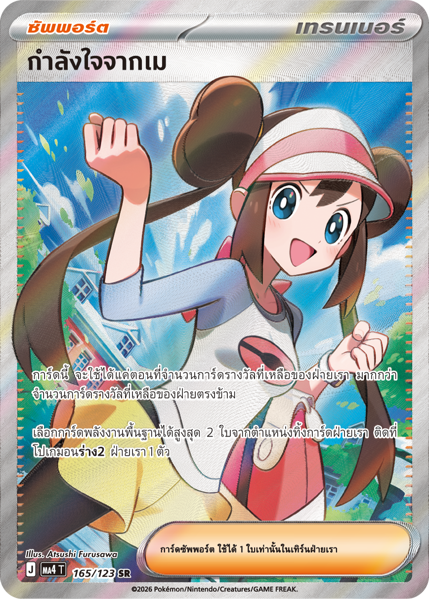 การ์ดนี้ จะใช้ได้แค่ตอนที่จำนวนการ์ดรางวัลที่เหลือของฝ่ายเรา มากกว่า จำนวนการ์ดรางวัลที่เหลือของฝ่ายตรงข้าม เลือกการ์ดพลังงานพื้นฐานได้สูงสุด 2 ใบจากตำแหน่งทิ้งการ์ดฝ่ายเรา ติดที่ โปเกมอน[ร่าง2] ฝ่ายเรา 1 ตัว