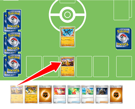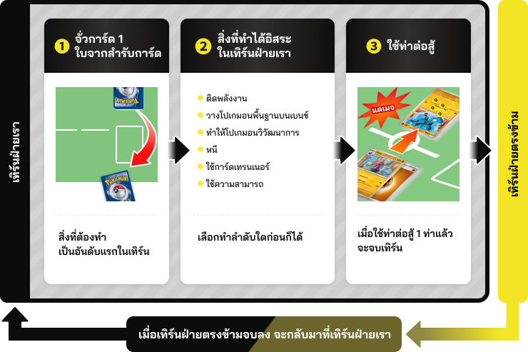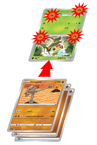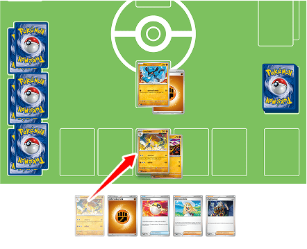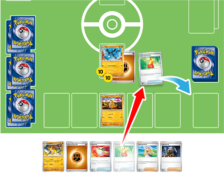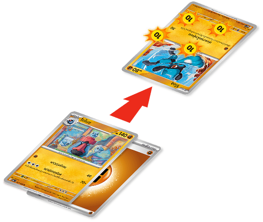 ถ้าบนมือมี [โปเกมอนวิวัฒนาการ] ที่จะวิวัฒนาการจากโปเกมอนบนกระดาน สามารถนำออกจากมือให้วิวัฒนาการได้ นำการ์ดนั้นมาวางซ้อนบนโปเกมอนที่มีสัญลักษณ์วิวัฒนาการเขียนไว้