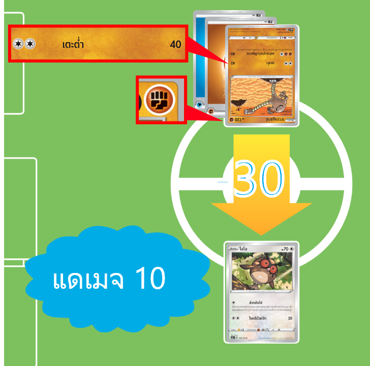 เมื่อใช้ท่าต่อสู้แล้ว ให้ทำแดเมจกับโปเกมอนบนตำแหน่งต่อสู้ของฝ่ายตรงข้ามตามจำนวนตัวเลข ถ้ามีคำอธิบายเขียนไว้ ให้ปฏิบัติตามคำอธิบายนั้น