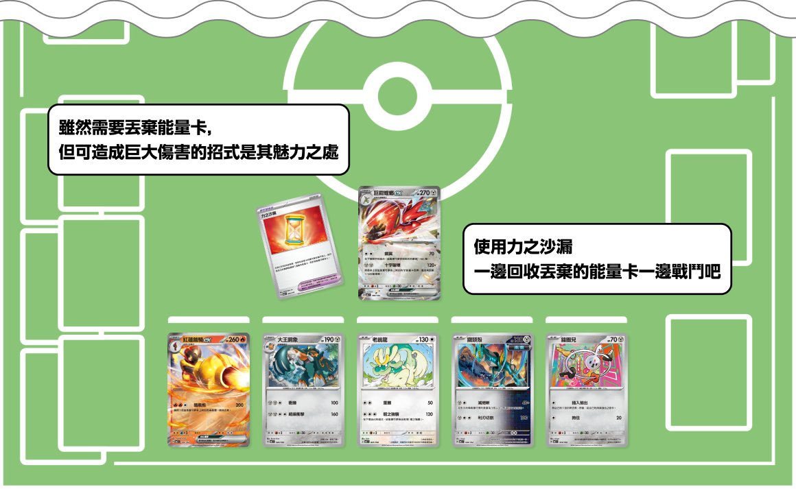 將能量卡丟棄便可使出強力招式戰鬥的牌組。為戰鬥寶可夢附加力之沙漏,將丟棄的能量卡反覆再利用,持續使用強力的招式吧。