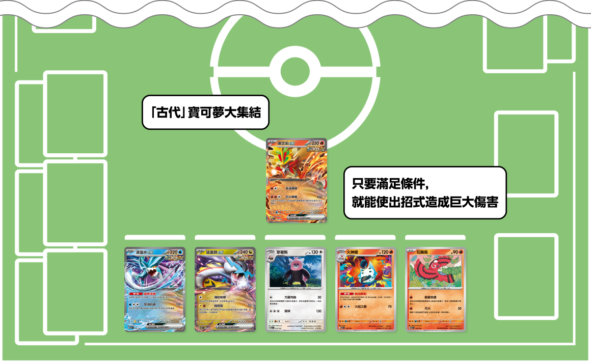 加入了「古代」寶可夢們的牌組,各自擁有滿足條件便可造成巨大傷害的招式。能不能巧妙滿足各自的條件,發揮出大家的力量,就是展現實力的關鍵。