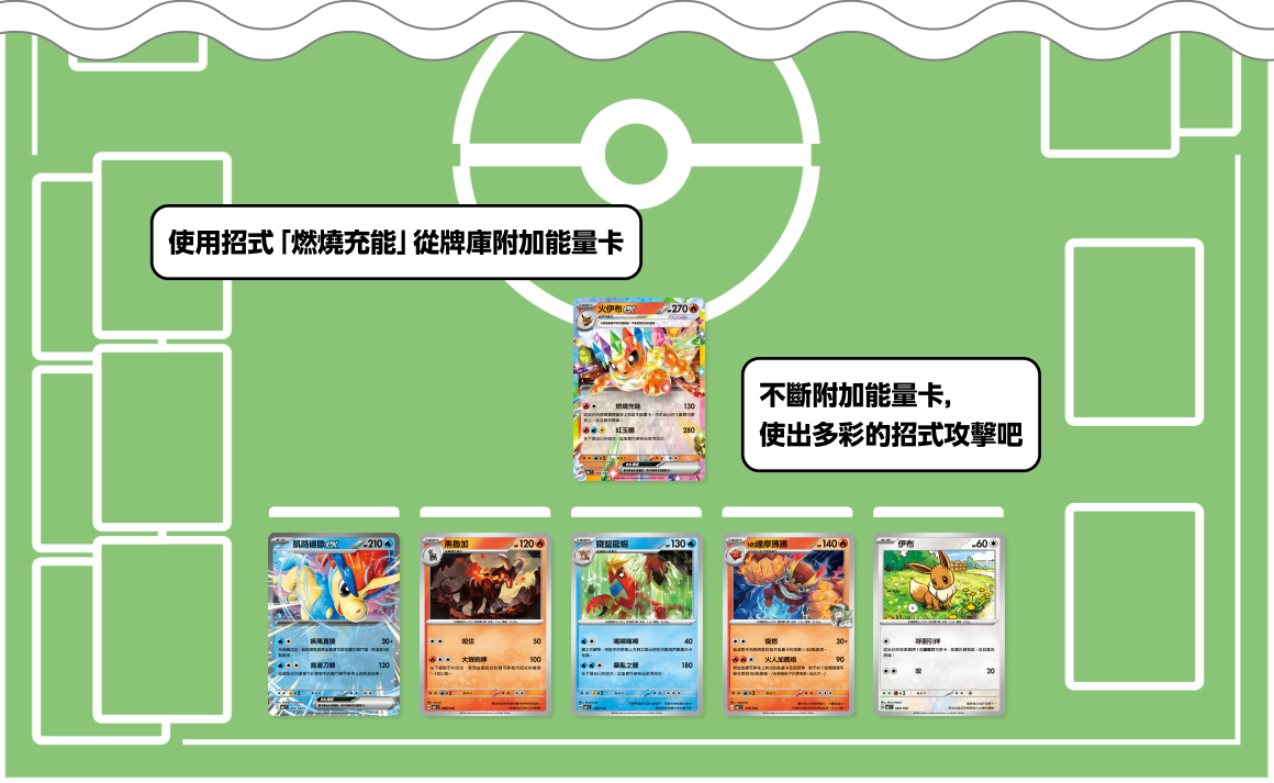 - 開局使用火伊布ex的招式「燃燒充能」集中培育其他寶可夢。