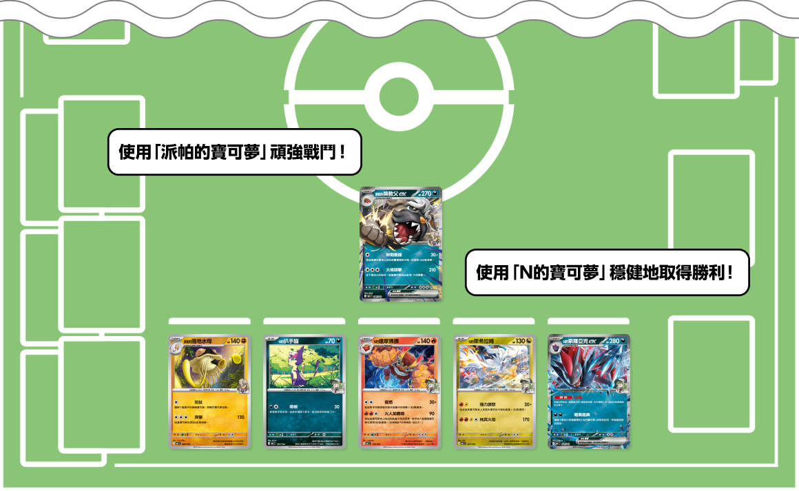 使用少量能量就能頑強戰鬥的「派帕的寶可夢」在開局對戰的同時,在備戰區培育「N的寶可夢」吧。等「N的寶可夢」們的招式準備完畢後,就用多樣化的戰略將對手玩弄於股掌之中,取得勝利吧。