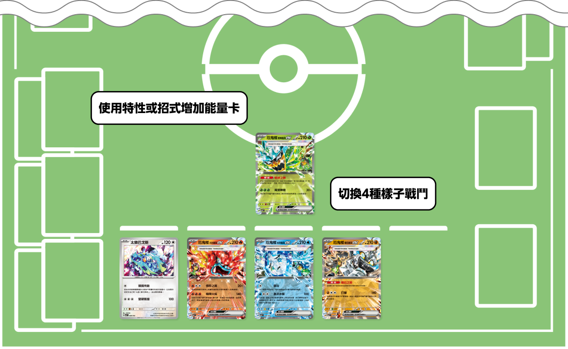 視情況使用會變化為不同樣子的厄鬼椪來戰鬥的技術型牌組。使用增加能量卡的招式或特性來培育寶可夢,視情況熟練運用4種屬性吧。