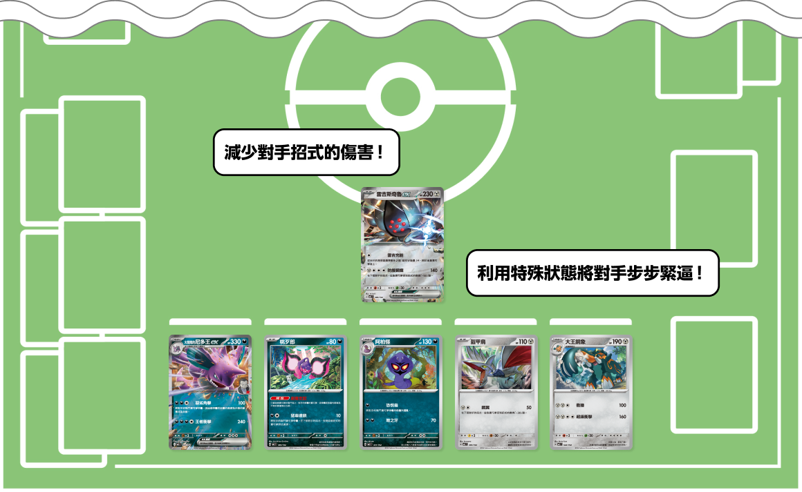 此牌組中加入了一邊攻擊一邊減少受到的傷害的鋼寶可夢,與可以讓對手「中毒」的惡寶可夢。依據對手的寶可夢,視情況使用兩種戰術吧。