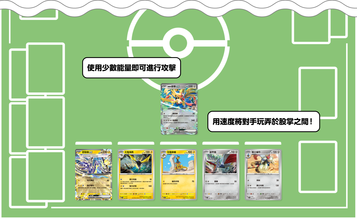 - 與從手牌附加的能量卡配合,寶可夢就能在放置於場上後馬上使出強力的招式。