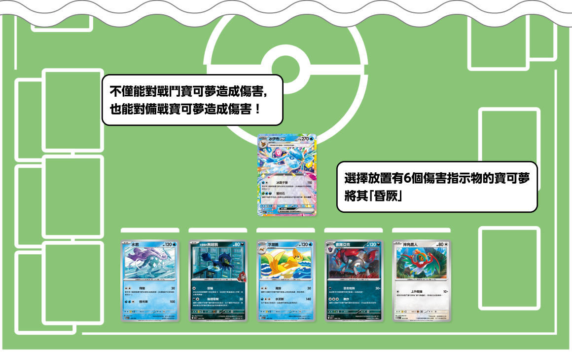 寶可夢的招式不僅可以對對戰鬥寶可夢造成傷害,還可以對備戰寶可夢造成30點傷害。鎖定對手在備戰區培育的寶可夢,或是受到傷害後撤退的寶可夢,破壞對手的戰略戰鬥吧。