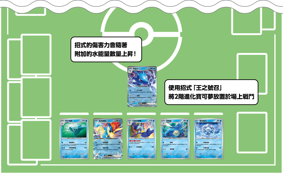 聚集了擁有強力的招式或特性的2階進化水寶可夢的牌組。刺龍王ex的招式「水炮」會根據身上附加的水能量的數量提升傷害。附加大量能量,一擊就將對手的寶可夢「昏厥」吧。