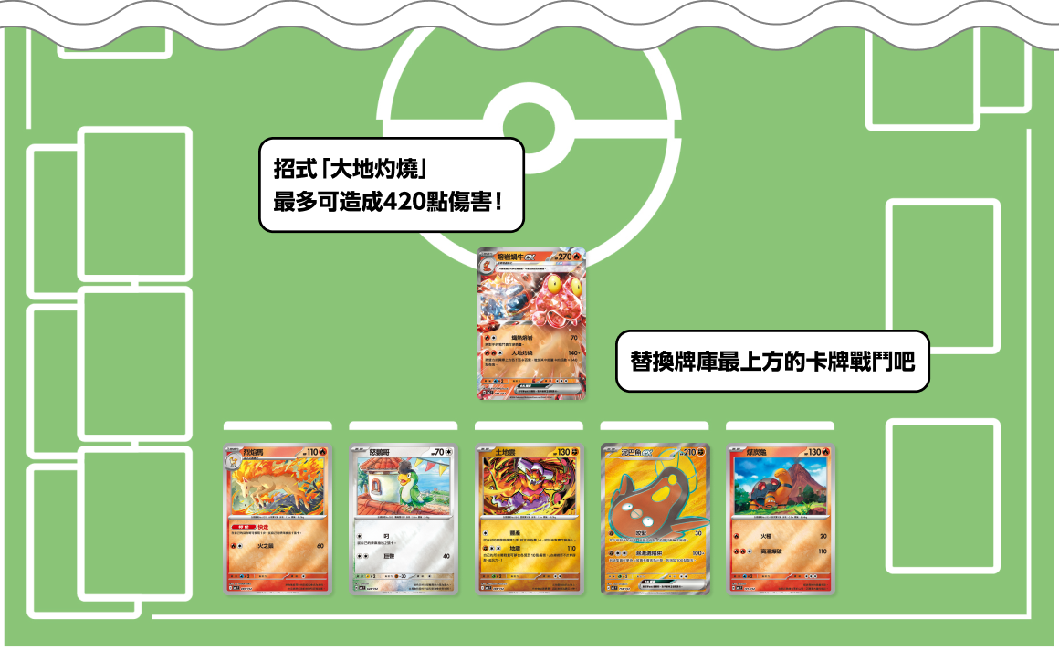 可以替換牌庫上方卡牌的訓練家卡。把能量卡放置在最上方,提升招式「大地灼燒」的傷害吧。