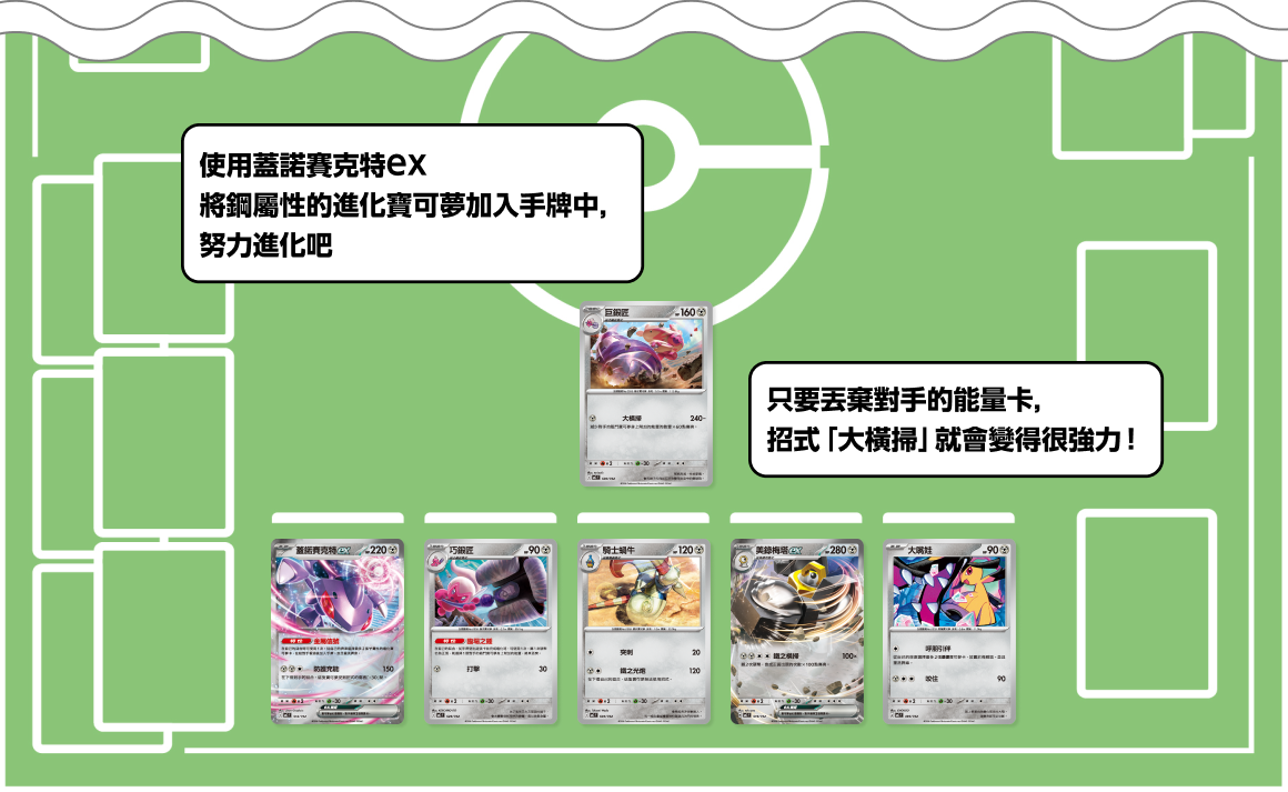 使出招式「呼朋引伴」可以從牌庫選擇最多2張基礎寶可夢卡放置於備戰區。若能放置小鍛匠和蓋諾賽克特ex,就能一口氣做好放置巨鍛匠的準備了。
