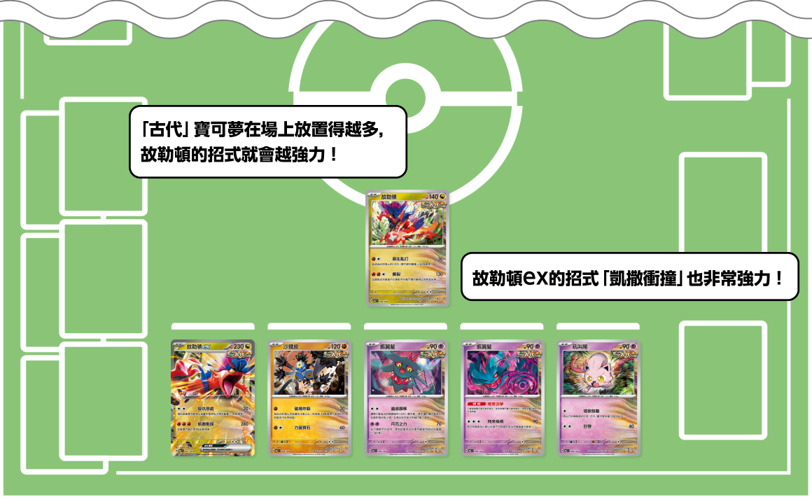 僅由「古代」寶可夢構成的牌組。使用可以幫助「古代」寶可夢的招式或訓練家卡,讓擁有高攻擊力的2張故勒頓大顯身手吧。