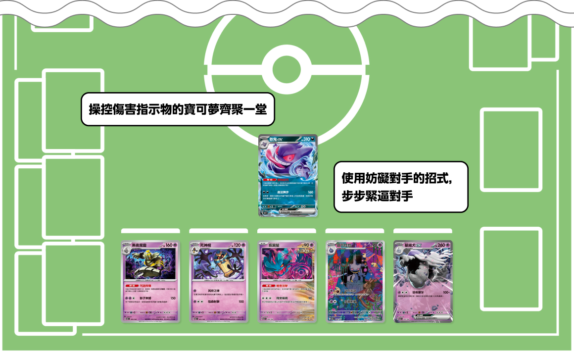 - 耿鬼ex或黑夜魔靈等擁有強力特性的進化寶可夢,是這副牌組的主角。
