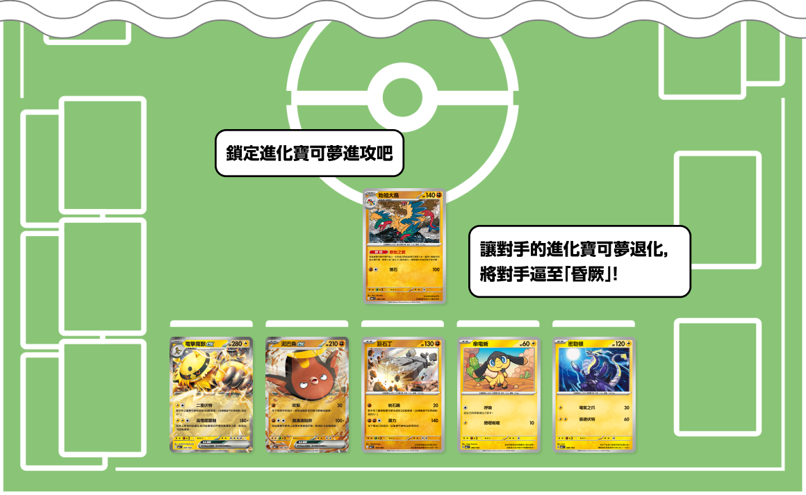 - 若被退化的寶可夢撤退回備戰區,就用電擊魔獸ex或巨石丁的招式將其昏厥吧。