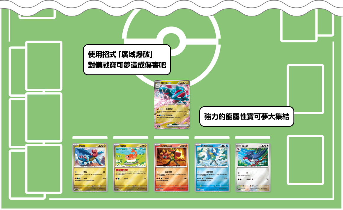 這副牌組聚集了持有強力招式且沒有弱點的龍屬性寶可夢。使出招式需要火能量和水能量,只要培育完畢,就能讓對手甘拜下風。