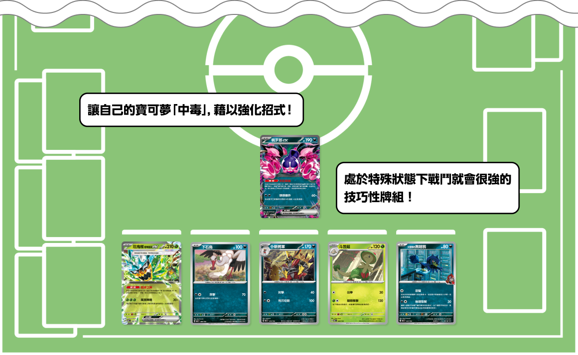 桃歹郎ex的特性可以將備戰區的惡寶可夢與戰鬥寶可夢互換,但是互換的寶可夢會「中毒」。「中毒」看起來是缺點,但若與鎖鏈糬組合使用,「中毒」是可以提升招式傷害數值的喔。