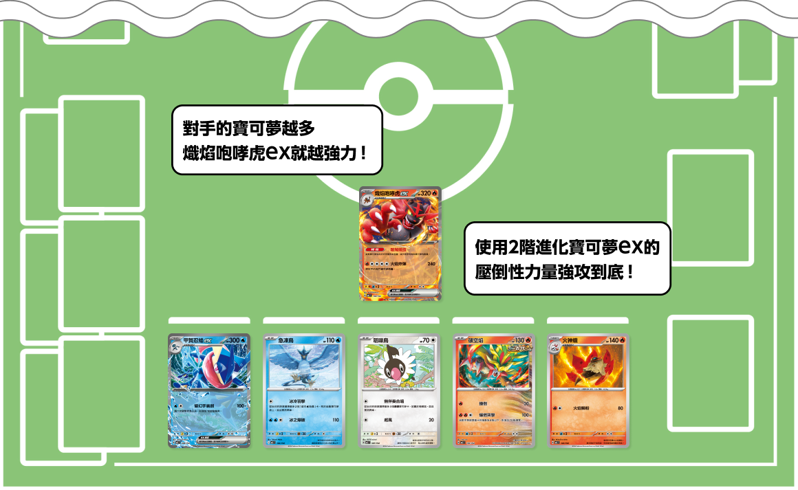 可以一口氣放置能夠進化為寶可夢ex的呱呱泡蛙或火斑喵,以及從開局開始就可以很快出招的急凍鳥等。