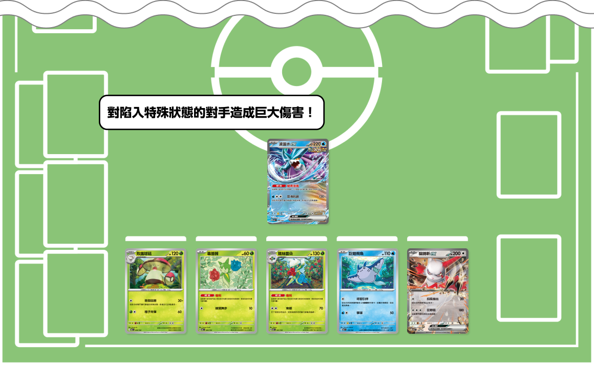 若對手是陷入了特殊狀態的寶可夢,敗露球菇、波盪水ex的招式就會變強。敗露球菇的招式「險惡回應」僅需1個無能量就能造成高達150點傷害,特別好用。