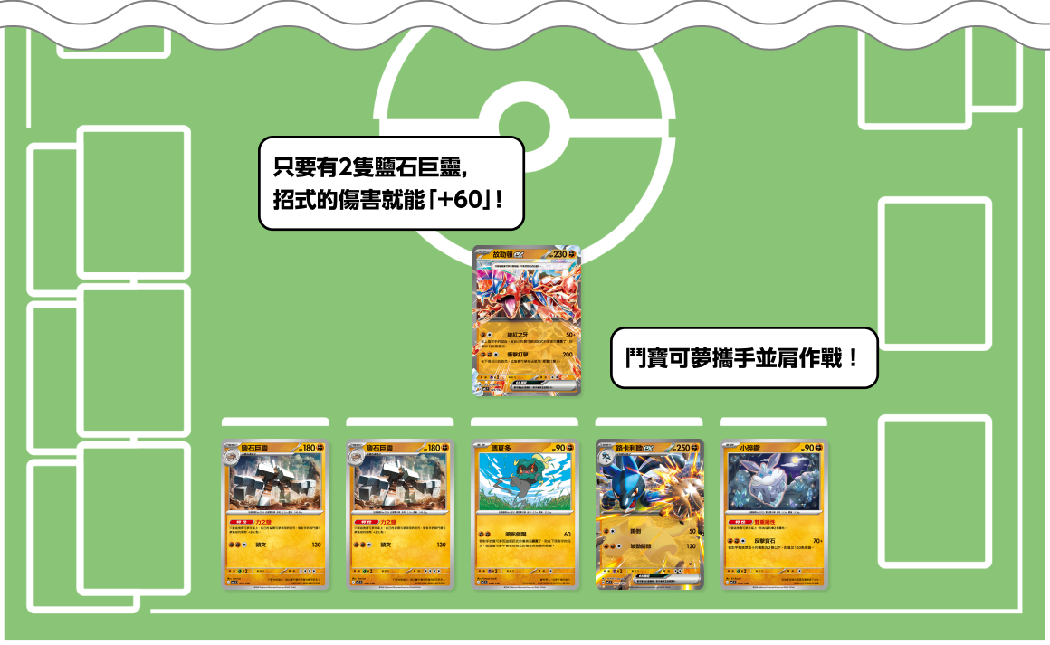 鹽石巨靈的特性「力之鹽」可以將鬥寶可夢的招式的傷害「+30」點。放置數隻,將路卡利歐ex、瑪夏多與故勒頓ex的招式加以強化吧。