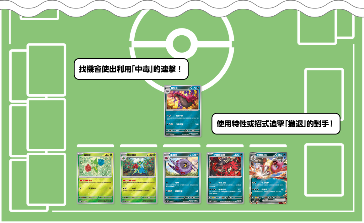 利用羅絲雷朵的特性「毒刺」或百足蜈蚣的招式「毒液」讓對手的戰鬥寶可夢「中毒」,為連擊鋪路。