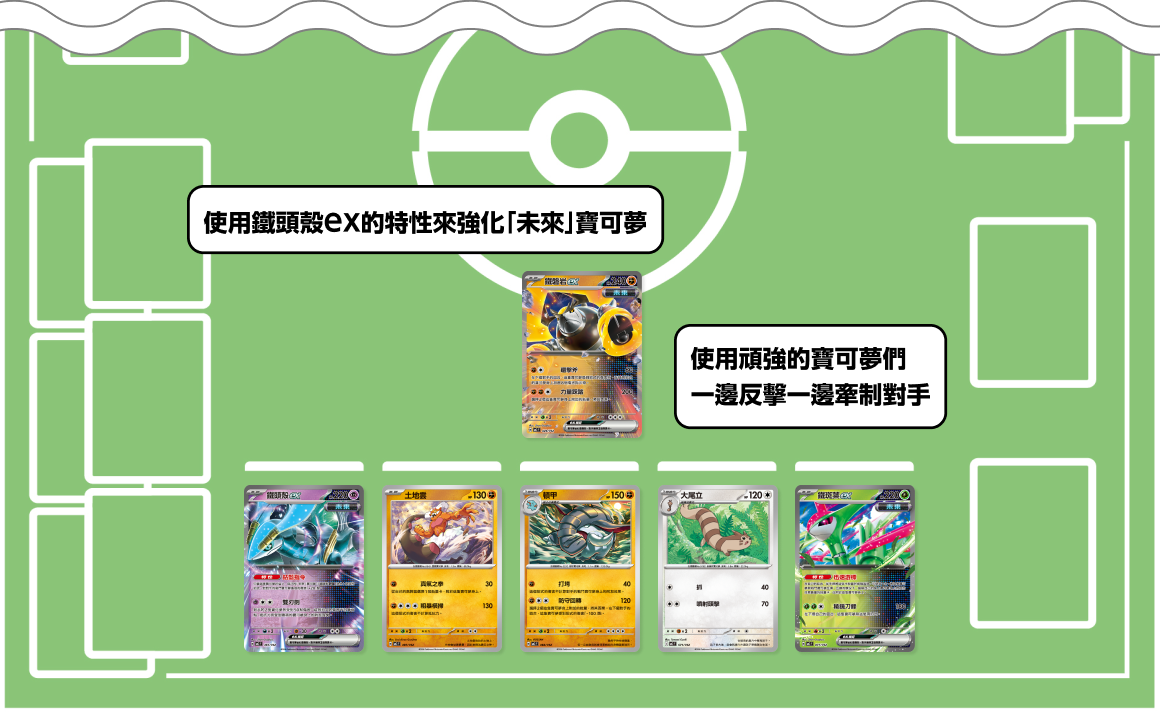 早點放置鐵頭殼ex,使用特性「鈷藍指令」強化「未來」寶可夢們,進行戰鬥吧。鐵斑葉ex、鐵頭殼ex和鐵磐岩ex各自擁有強力的招式,根據情況分別使用吧。