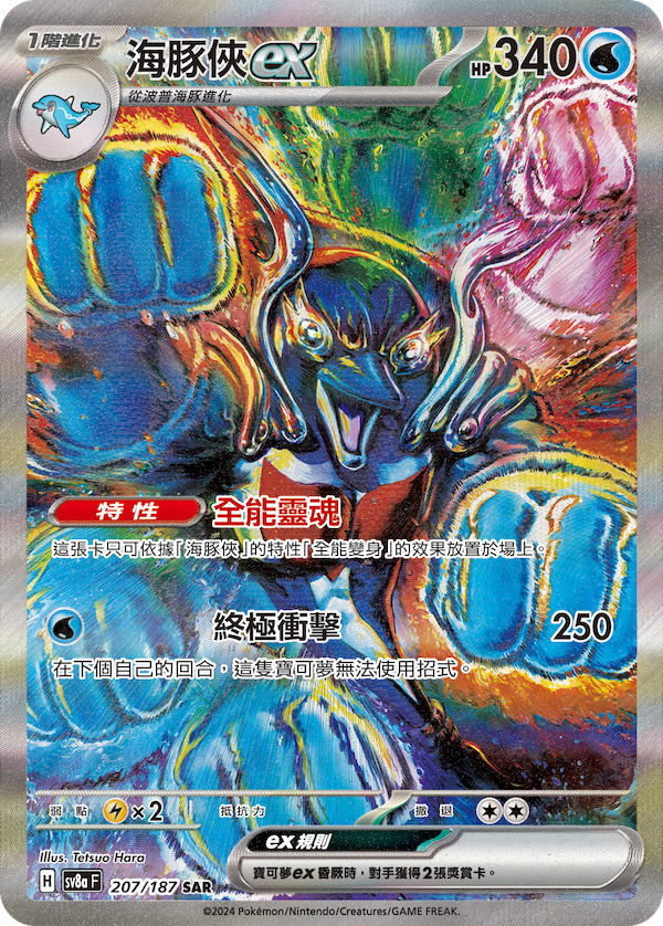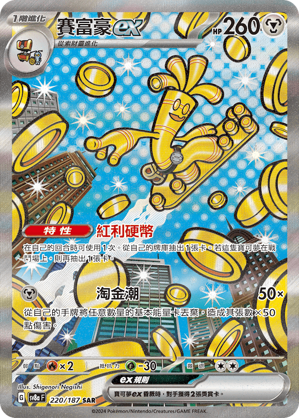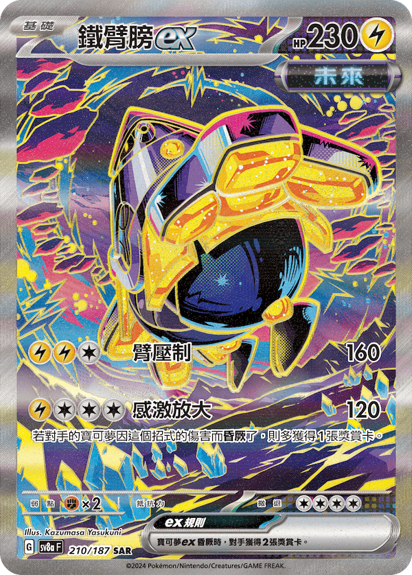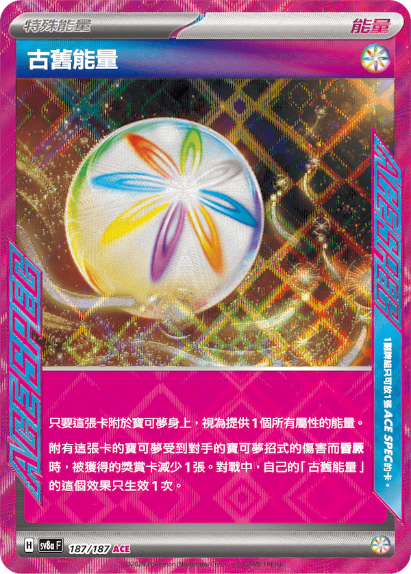 「ACE SPEC」的特殊能量卡。附有這張卡的寶可夢受到對手的寶可夢招式的傷害而昏厥時,被獲得的獎賞卡減少1張。此外,只要這張卡附於寶可夢身上,視為提供1個所有屬性的能量,因此是和各種寶可夢搭配效果都很好的1張卡牌!