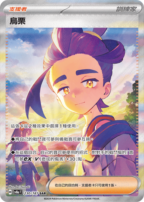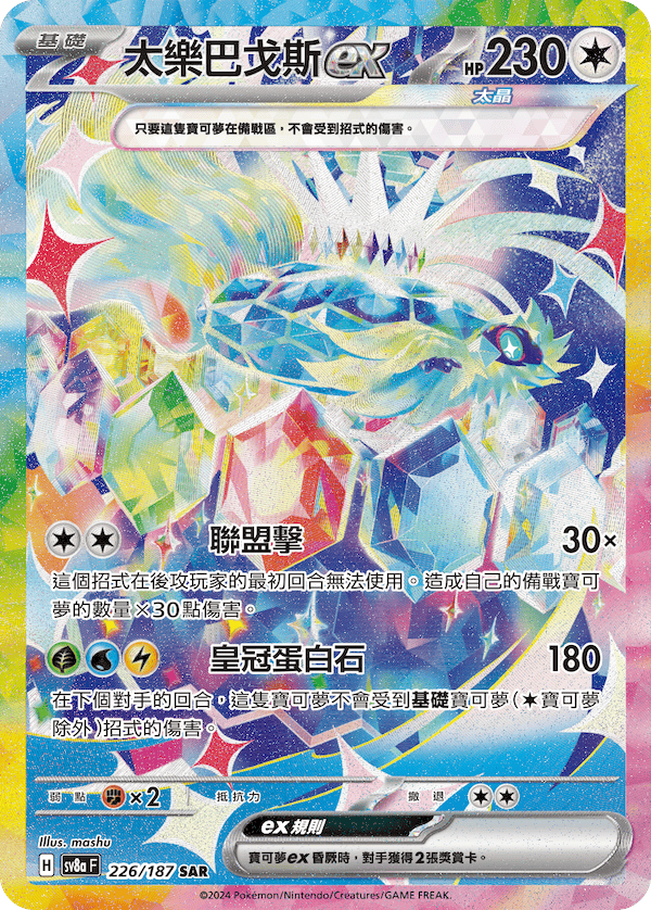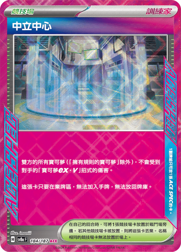 只要這張競技場卡放置於場上,雙方的所有寶可夢(「擁有規則的寶可夢」除外),不會受到對手的「寶可夢ex・V」招式的傷害。