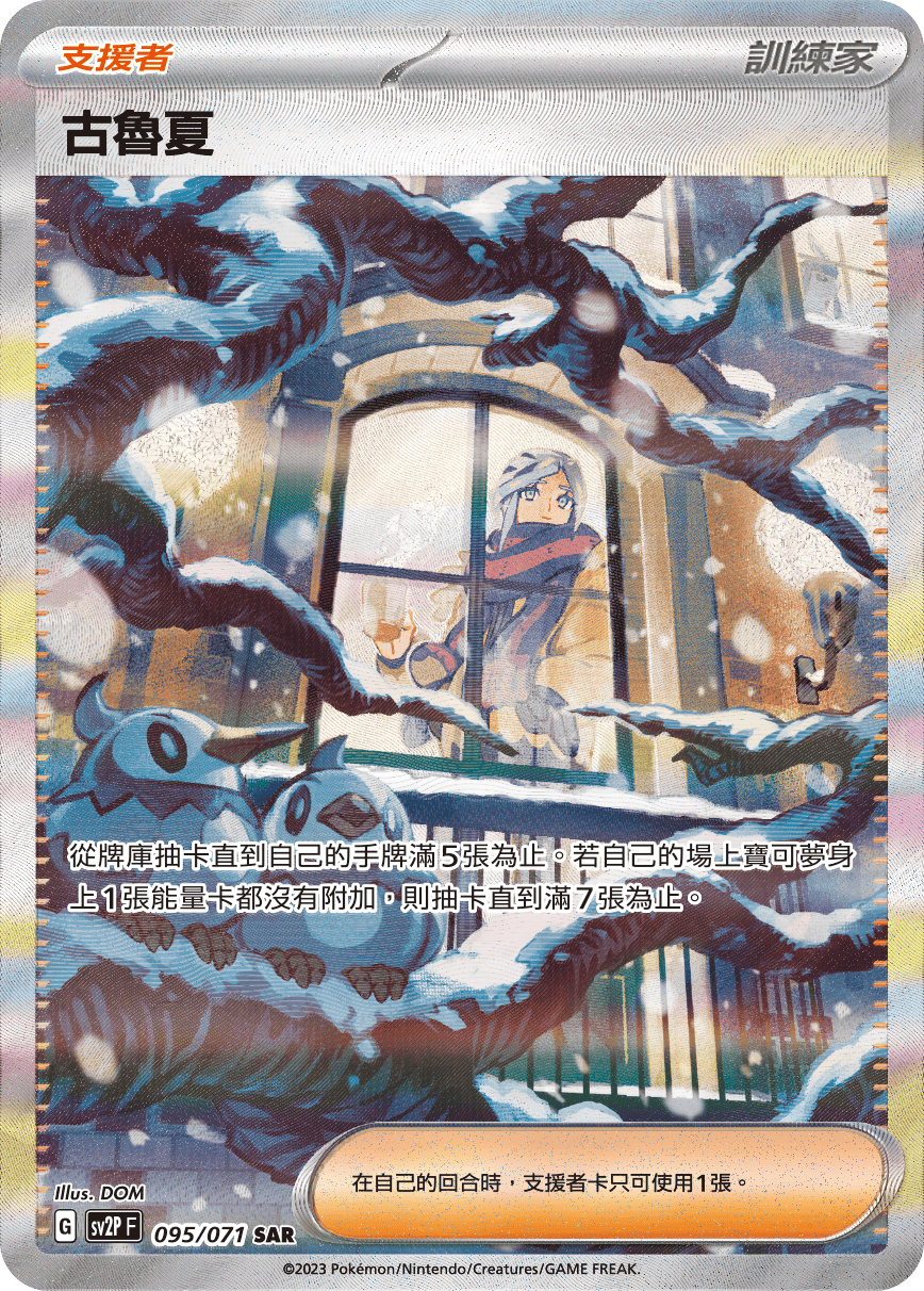 從牌庫抽卡直到自己的手牌滿5張為止。若自己的場上寶可夢身上1張能量卡都沒有附加,則抽卡直到滿7張為止。