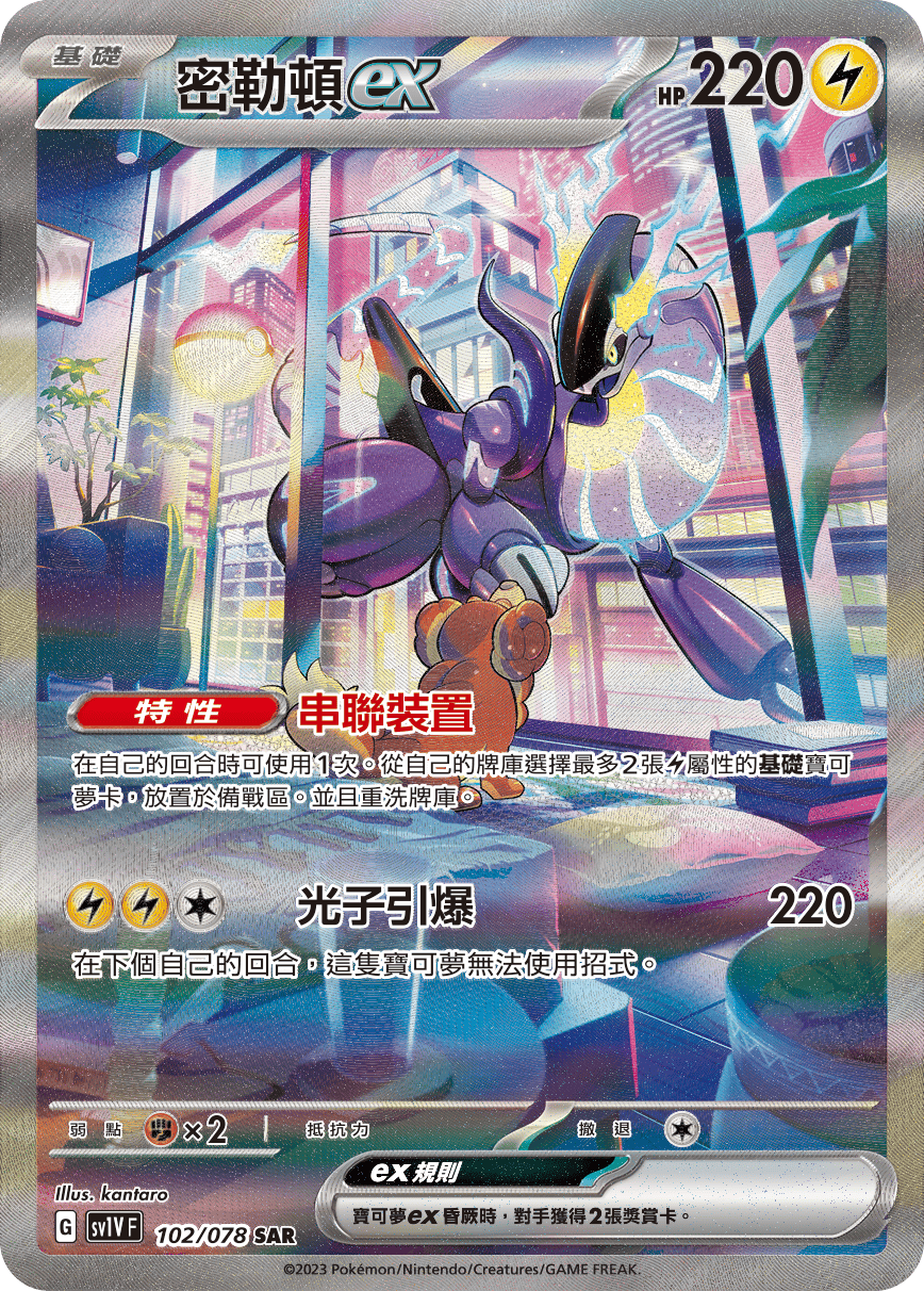 在自己的回合時可使用1次。從自己的牌庫選擇最多2張【雷】屬性的【基礎】寶可夢卡,放置於備戰區。並且重洗牌庫。
