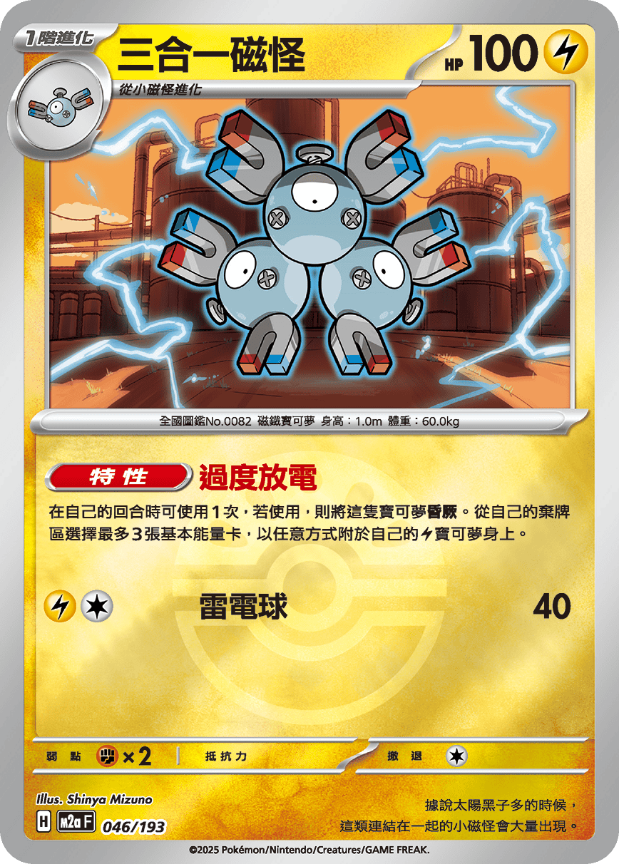 在自己的回合時可使用1次,若使用,則將這隻寶可夢【昏厥】。從自己的棄牌區選擇最多3張基本能量卡,以任意方式附於自己的【雷】寶可夢身上。