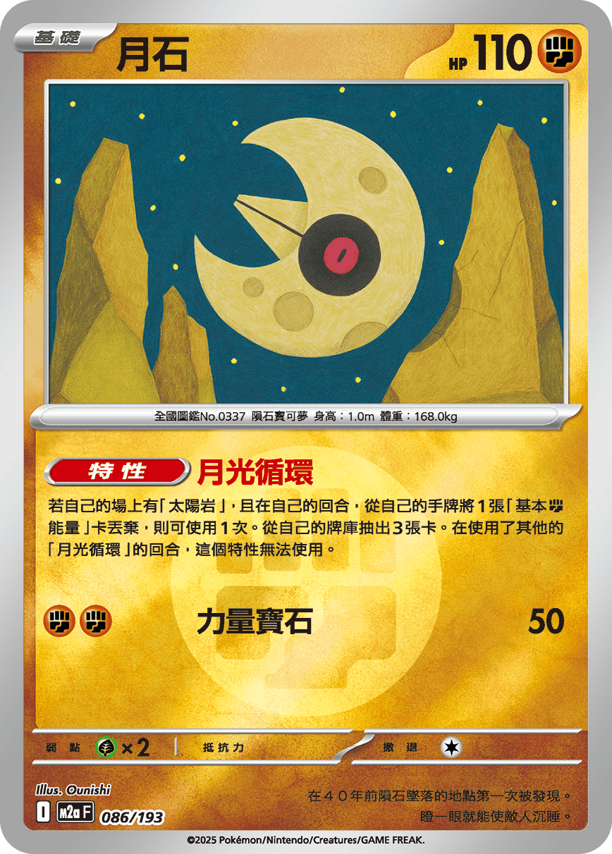 若自己的場上有「太陽岩」,且在自己的回合,從自己的手牌將1張「基本【鬥】能量」卡丟棄,則可使用1次。從自己的牌庫抽出3張卡。在使用了其他的「月光循環」的回合,這個特性無法使用。
