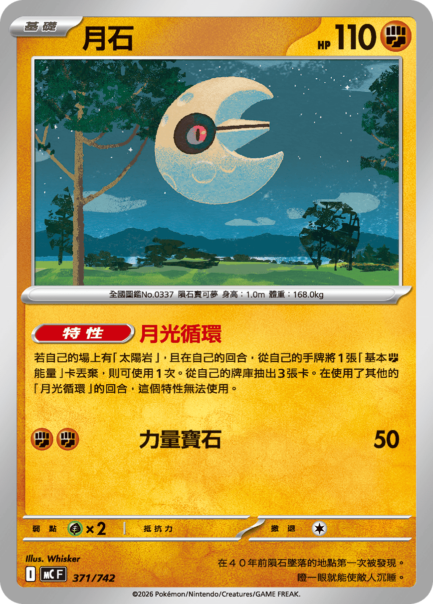 若自己的場上有「太陽岩」,且在自己的回合,從自己的手牌將1張「基本【鬥】能量」卡丟棄,則可使用1次。從自己的牌庫抽出3張卡。在使用了其他的「月光循環」的回合,這個特性無法使用。