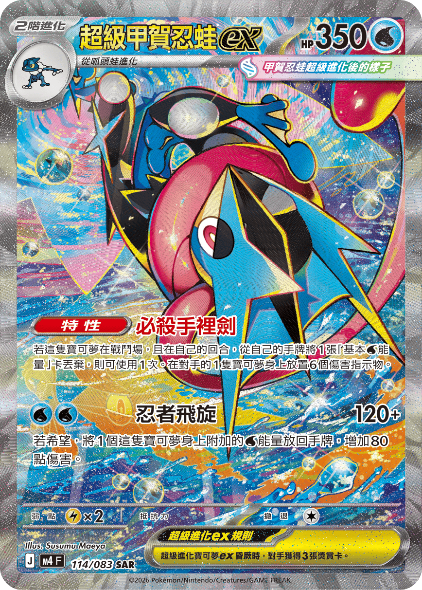 若這隻寶可夢在戰鬥場,且在自己的回合,從自己的手牌將1張「基本【水】能量」卡丟棄,則可使用1次。在對手的1隻寶可夢身上放置6個傷害指示物。