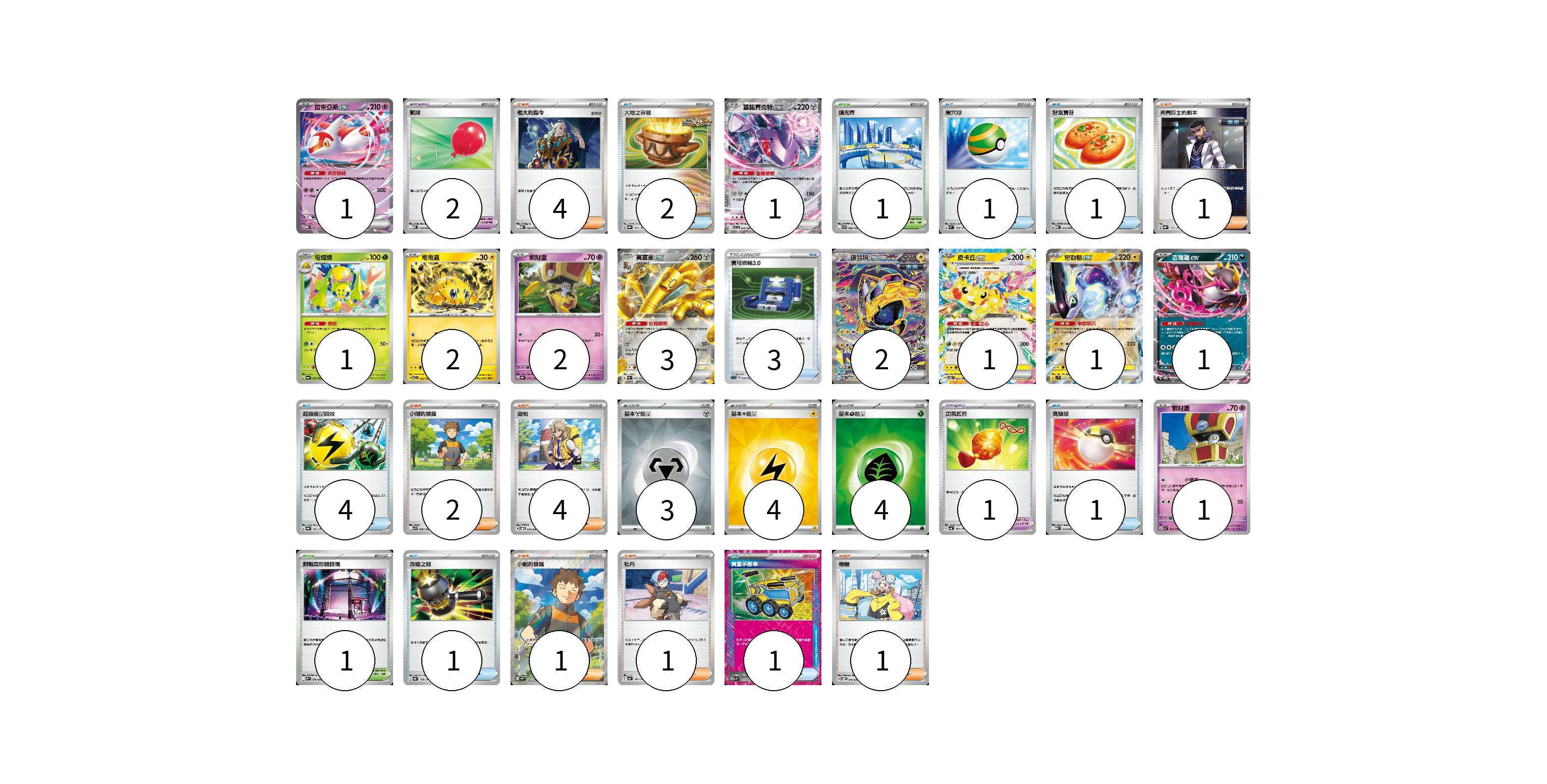 牌組構築方案 以此牌組為基礎新構築牌組 顯示卡面 顯示列表 寶可夢卡(16) 1 1 1 2 2 3 2 1 1 1 1 寶可夢道具(3) 2 1 物品卡(14) 2 1 1 3 4 1 1 1 支援者卡(14) 4 1 2 4 1 1 1 競技場卡(2) 1 1 能量卡(11) 3 4 4 寶可夢卡(16) 卡牌名稱 張數 卡牌名稱 張數 拉帝亞斯ex MBD 003/022 01 蓋諾賽克特ex SV11B 069/086 01 電蜘蛛 SV6a 002/064 01 電電蟲 SV7 032/102 02 索財靈 SV8a 073/187 02 賽富豪ex SV3a 050/062 03 鐵臂膀ex SV8a 210/187 02 皮卡丘ex SV8 033/106 01 密勒頓ex SV1V 037/078 01 吉雉雞ex SVOM 009/021 01 索財靈 SV7a 024/064 01 寶可夢道具(3) 卡牌名稱 張數 卡牌名稱 張數 氣球 MBD 018/022 02 勇氣護符 SV4a 169/190 01 物品卡(14) 卡牌名稱 張數 卡牌名稱 張數 大地之容器 SV8a 143/187 02 巢穴球 SVM 133/175 01 好友寶芬 MBD 013/022 01 寶可齒輪3.0 SLD 014/020 03 超級能量回收 SV8a 141/187 04 高級球 MBD 014/022 01 改造之錘 SV8a 138/187 01 貴重手推車 SVK 020/042 01 支援者卡(14) 卡牌名稱 張數 卡牌名稱 張數 老大的指令 MBD 020/022 04 弗圖博士的劇本 SV8a 175/187 01 小剛的發掘 SV9 096/100 02 派帕 SVOD 018/020 04 小剛的發掘 SV9 123/100 01 牡丹 SV4a 182/190 01 奇樹 SVOD 016/020 01 競技場卡(2) 卡牌名稱 張數 卡牌名稱 張數 釀光市 SV9 098/100 01 對戰圓形競技場 M2 079/080 01 能量卡(11) 卡牌名稱 張數 卡牌名稱 張數 基本【鋼】能量 SVOD MET 03 基本【雷】能量 SVM LIG 04 基本【草】能量 SVM GRA 04 以此牌組為基礎新構築牌組 牌組編碼 AAuaho-EWPClp-XLTJml copy 列印牌組單 牌組編碼已複製 分享至SNS