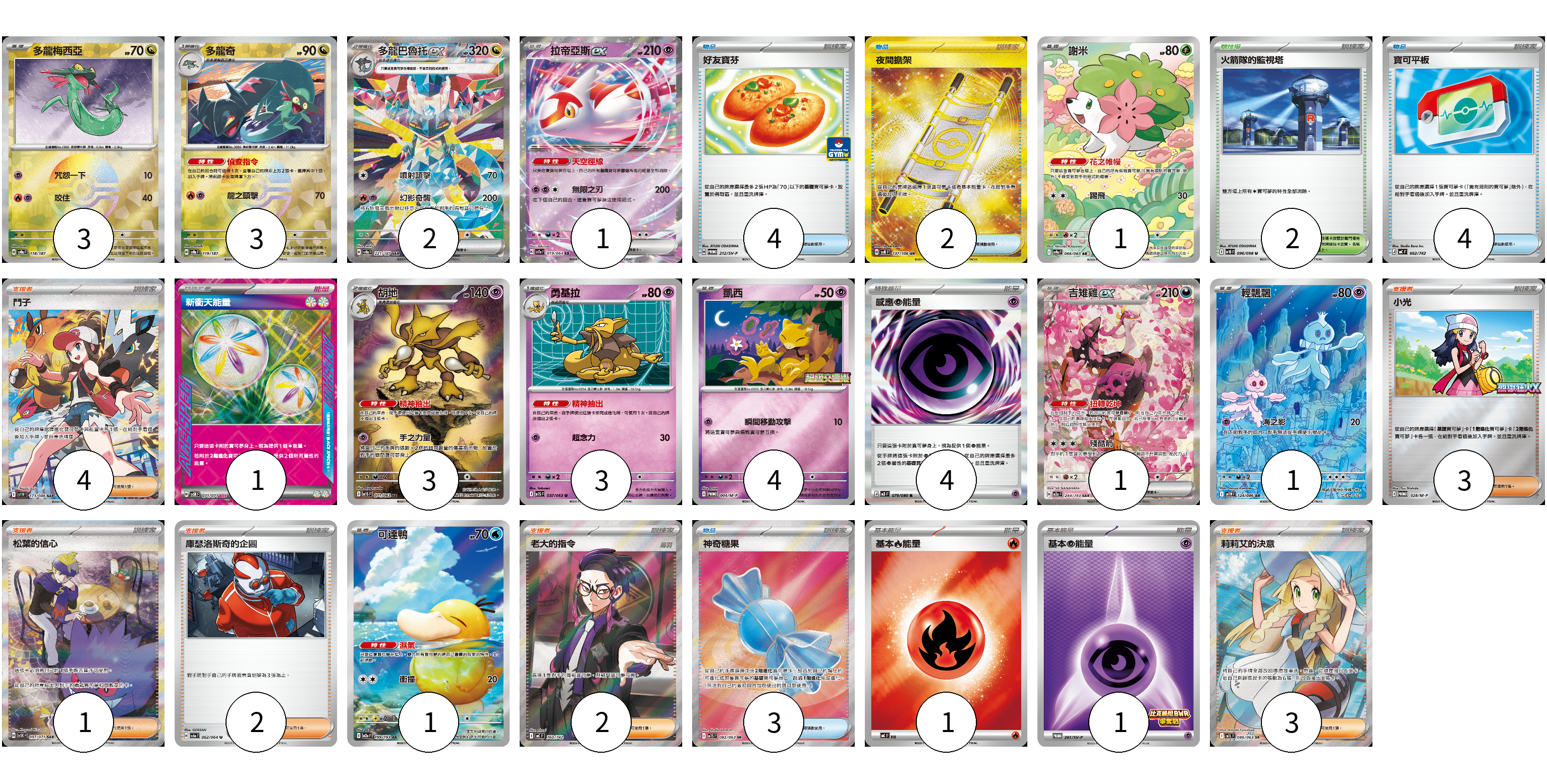 牌組構築方案 以此牌組為基礎新構築牌組 顯示卡面 顯示列表 寶可夢卡(23) 3 3 2 1 1 3 3 4 1 1 1 物品卡(13) 4 2 4 3 支援者卡(15) 4 3 1 2 2 3 競技場卡(2) 2 能量卡(7) 1 4 1 1 寶可夢卡(23) 卡牌名稱 張數 卡牌名稱 張數 多龍梅西亞 SV8a 118/187 03 多龍奇 SV8a 119/187 03 多龍巴魯托ex SV8a 221/187 02 拉帝亞斯ex SV7a 019/064 01 謝米 SV9a 066/063 01 胡地 M1S 071/063 03 勇基拉 M1S 037/063 03 凱西 M-P 004/M-P 04 吉雉雞ex M2a 244/193 01 輕飄飄 SV11W 124/086 01 可達鴨 M2a 199/193 01 物品卡(13) 卡牌名稱 張數 卡牌名稱 張數 好友寶芬 SV-P 212/SV-P 04 夜間擔架 SV8 137/106 02 寶可平板 MC 662/742 04 神奇糖果 M1S 082/063 03 支援者卡(15) 卡牌名稱 張數 卡牌名稱 張數 鬥子 SV11W 173/086 04 小光 M-P 028/M-P 03 松葉的信心 SV5K 097/071 01 庫瑟洛斯奇的企圖 SV6a 062/064 02 老大的指令(烏羽) MC 760/742 02 莉莉艾的決意 M1L 086/063 03 競技場卡(2) 卡牌名稱 張數 卡牌名稱 張數 火箭隊的監視塔 SV10 096/098 02 能量卡(7) 卡牌名稱 張數 卡牌名稱 張數 新衝天能量 SV5K 071/071 01 感應【超】能量 M3 079/080 04 基本【火】能量 MC FIR 01 基本【超】能量 SV-P 261/SV-P 01 以此牌組為基礎新構築牌組 牌組編碼 ACZwuC-HsQCFQ-SHkNcn copy 列印牌組單 牌組編碼已複製 分享至SNS