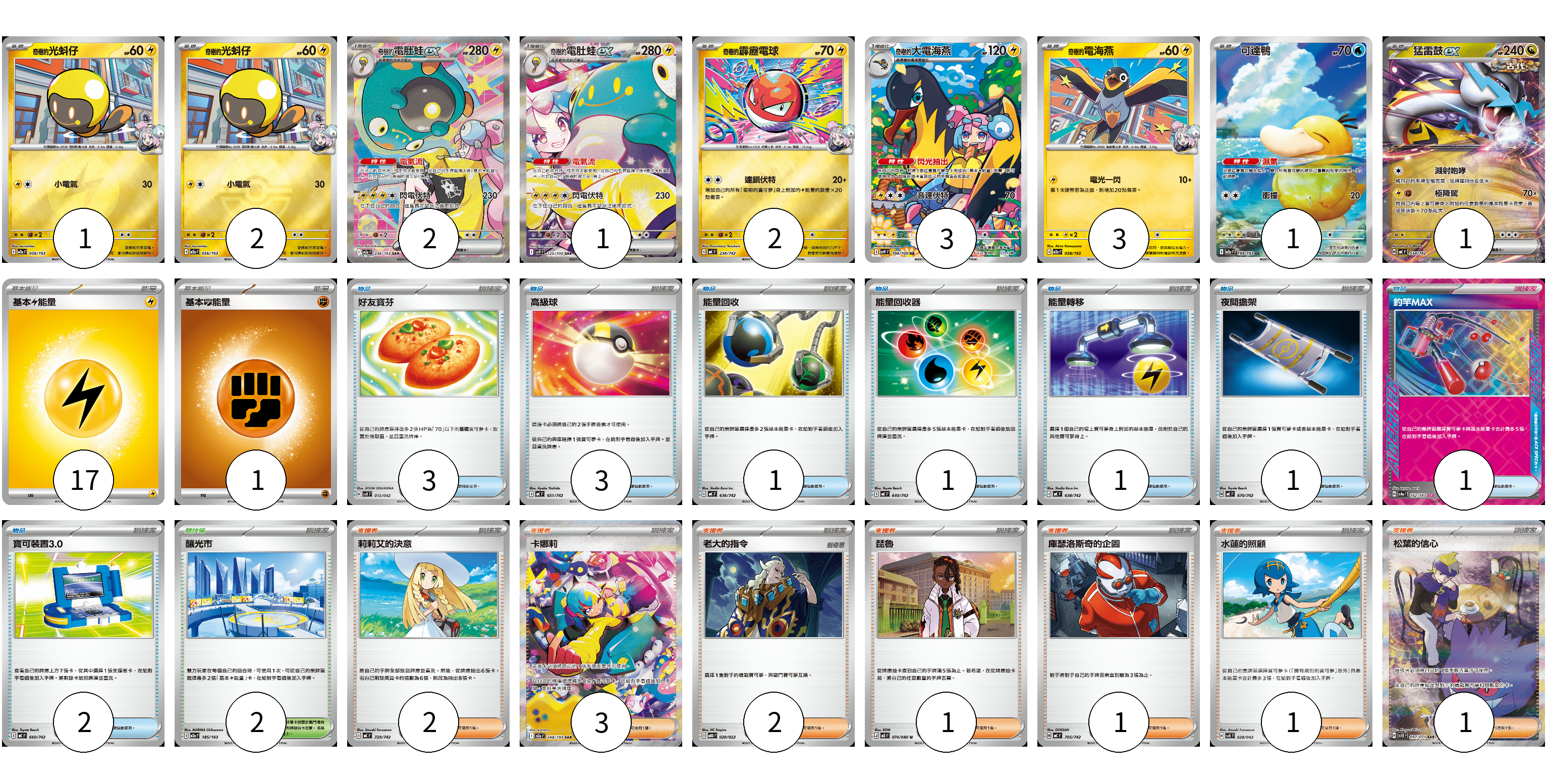 牌組構築方案 以此牌組為基礎新構築牌組 顯示卡面 顯示列表 寶可夢卡(16) 1 2 2 1 2 3 3 1 1 物品卡(13) 3 3 1 1 1 1 1 2 支援者卡(11) 2 3 2 1 1 1 1 競技場卡(2) 2 能量卡(18) 17 1 寶可夢卡(16) 卡牌名稱 張數 卡牌名稱 張數 奇樹的光蚪仔 M2a 056/193 01 奇樹的光蚪仔 M2a 056/193 02 奇樹的電肚蛙ex M2a 236/193 02 奇樹的電肚蛙ex SV9 125/100 01 <奇樹的>霹靂電球 MC 234/742 02 奇樹的大電海燕 SV9 104/100 03 奇樹的電海燕 M2a 058/193 03 可達鴨 M2a 199/193 01 猛雷鼓ex MC 554/742 01 物品卡(13) 卡牌名稱 張數 卡牌名稱 張數 好友寶芬 SVK 015/042 03 高級球 MC 651/742 03 能量回收 MC 636/742 01 能量回收器 MC 640/742 01 能量轉移 MC 638/742 01 夜間擔架 MC 670/742 01 釣竿MAX SV8a 142/187 01 寶可裝置3.0 MC 660/742 02 支援者卡(11) 卡牌名稱 張數 卡牌名稱 張數 莉莉艾的決意 MC 729/742 02 卡娜莉 M2a 248/193 03 老大的指令 MBD 020/022 02 琵魯 M3 074/080 01 庫瑟洛斯奇的企圖 MC 705/742 01 水蓮的照顧 SVK 028/042 01 松葉的信心 SV5K 097/071 01 競技場卡(2) 卡牌名稱 張數 卡牌名稱 張數 釀光市 M2a 185/193 02 能量卡(18) 卡牌名稱 張數 卡牌名稱 張數 基本【雷】能量 MJ LIG 17 基本【鬥】能量 MC FIG 01 以此牌組為基礎新構築牌組 牌組編碼 ADVNZY-iZjLTS-udJqMD copy 列印牌組單 牌組編碼已複製 分享至SNS