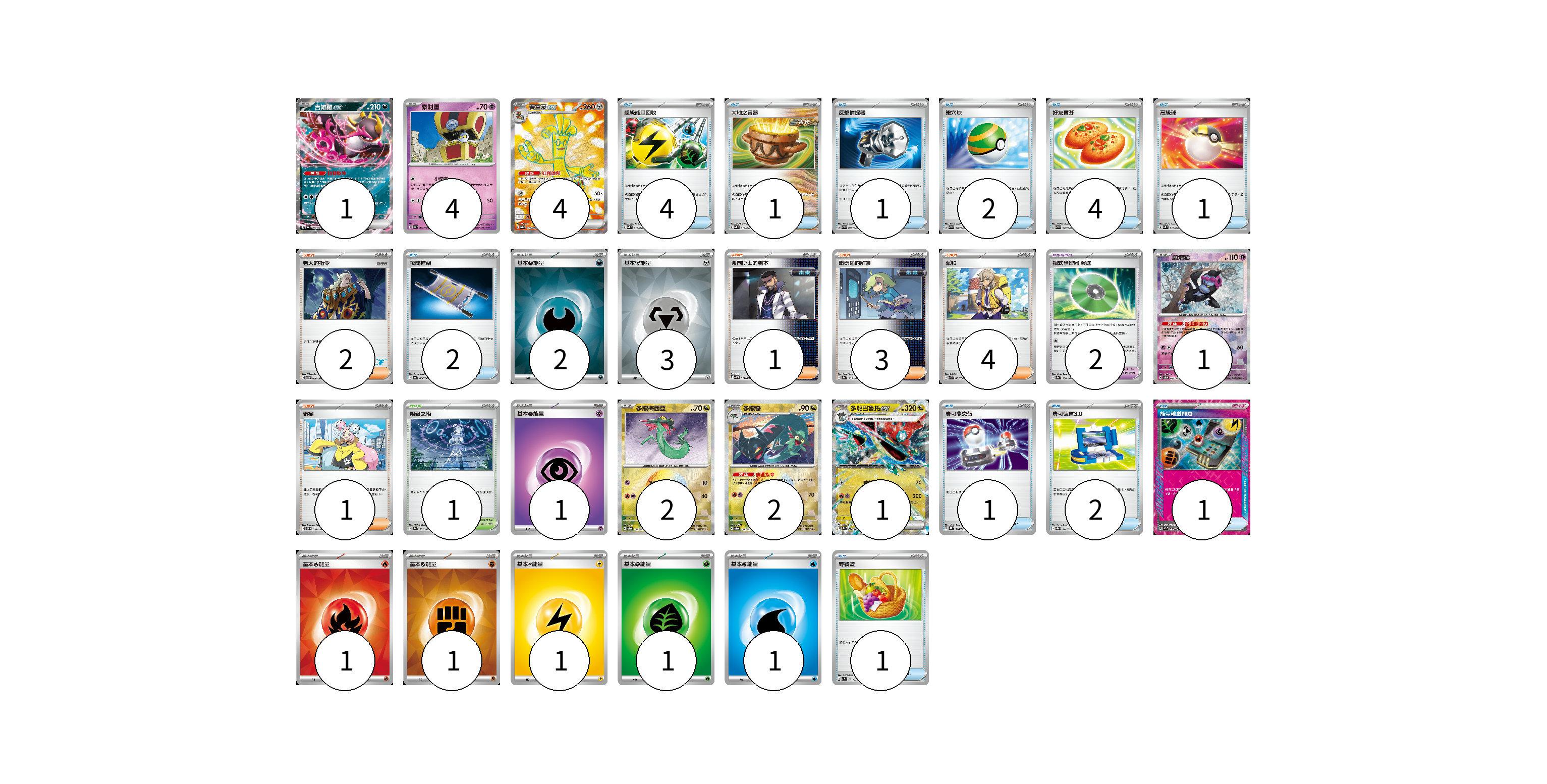 牌組構築方案 以此牌組為基礎新構築牌組 顯示卡面 顯示列表 寶可夢卡(15) 1 4 4 1 2 2 1 寶可夢道具(2) 2 物品卡(20) 4 1 1 2 4 1 2 1 2 1 1 支援者卡(11) 2 1 3 4 1 競技場卡(1) 1 能量卡(11) 2 3 1 1 1 1 1 1 寶可夢卡(15) 卡牌名稱 張數 卡牌名稱 張數 吉雉雞ex SV6a 038/064 01 索財靈 SV7a 024/064 04 賽富豪ex SV3a 079/062 04 願增猿 SV8a 075/187 01 多龍梅西亞 SV8a 118/187 02 多龍奇 SV8a 119/187 02 多龍巴魯托ex SV8a 120/187 01 寶可夢道具(2) 卡牌名稱 張數 卡牌名稱 張數 招式學習器 演進 SV8a 160/187 02 物品卡(20) 卡牌名稱 張數 卡牌名稱 張數 超級能量回收 SVK 010/042 04 大地之容器 SVK 012/042 01 反擊捕捉器 SVK 009/042 01 巢穴球 SVK 016/042 02 好友寶芬 SVK 015/042 04 高級球 SVK 018/042 01 夜間擔架 SV6a 056/064 02 寶可夢交替 SVHK 014/022 01 寶可裝置3.0 SVEM 014/020 02 能量輸送PRO SV7a 052/064 01 野餐籃 SV1V 071/078 01 支援者卡(11) 卡牌名稱 張數 卡牌名稱 張數 老大的指令 SVI 066/066 02 弗圖博士的劇本 SVHM 021/022 01 暗碼迷的解讀 SV8a 165/187 03 派帕 SVK 035/042 04 奇樹 SVOM 018/021 01 競技場卡(1) 卡牌名稱 張數 卡牌名稱 張數 阻礙之塔 SV8a 181/187 01 能量卡(11) 卡牌名稱 張數 卡牌名稱 張數 基本【惡】能量 SVK DAR 02 基本【鋼】能量 SVK MET 03 基本【超】能量 SVEM PSY 01 基本【火】能量 SVK FIR 01 基本【鬥】能量 SVK FIG 01 基本【雷】能量 SVF LIG 01 基本【草】能量 SVF GRA 01 基本【水】能量 SVF WAT 01 以此牌組為基礎新構築牌組 牌組編碼 AEBwhr-cnRxEy-XiSrQL copy 列印牌組單 牌組編碼已複製 分享至SNS