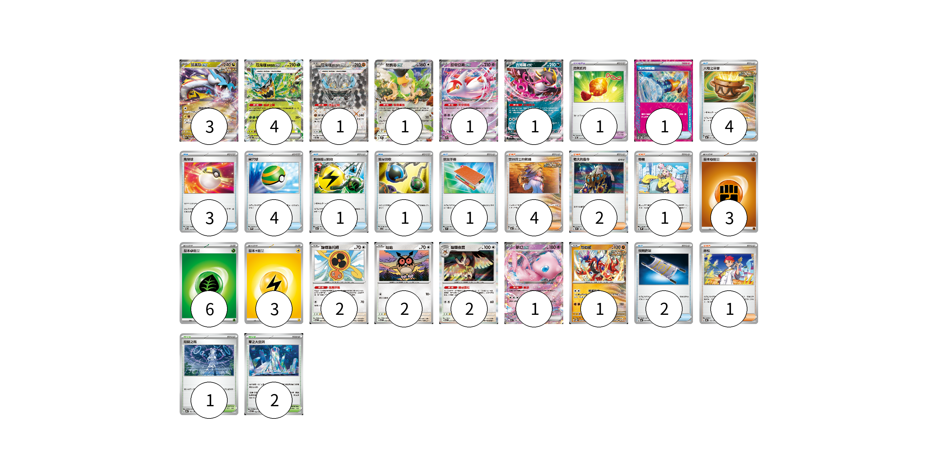 牌組構築方案 以此牌組為基礎新構築牌組 顯示卡面 顯示列表 寶可夢卡(19) 3 4 1 1 1 1 2 2 2 1 1 寶可夢道具(1) 1 物品卡(17) 1 4 3 4 1 1 1 2 支援者卡(8) 4 2 1 1 競技場卡(3) 1 2 能量卡(12) 3 6 3 寶可夢卡(19) 卡牌名稱 張數 卡牌名稱 張數 猛雷鼓ex SV5K 053/071 03 厄鬼椪 碧草面具ex SV6 016/101 04 厄鬼椪 礎石面具ex SV6 119/101 01 怒鸚哥ex SV2P 065/071 01 拉帝亞斯ex SV7a 019/064 01 吉雉雞ex SV6a 038/064 01 旋轉洛托姆 SV7 080/102 02 咕咕 SV7 076/102 02 貓頭夜鷹 SV7 077/102 02 夢幻ex SV4a 076/190 01 故勒頓 SV8 069/106 01 寶可夢道具(1) 卡牌名稱 張數 卡牌名稱 張數 勇氣護符 SVEM 016/020 01 物品卡(17) 卡牌名稱 張數 卡牌名稱 張數 頂尖捕捉器 SV5M 062/071 01 大地之容器 SV4K 060/066 04 高級球 SVEM 013/020 03 巢穴球 SVAW 014/023 04 超級能量回收 SV4a 157/190 01 能量回收 SVD 110/139 01 朋友手冊 SV1S 069/078 01 夜間擔架 SV6a 056/064 02 支援者卡(8) 卡牌名稱 張數 卡牌名稱 張數 奧琳博士的氣魄 SV4K 064/066 04 老大的指令 SV4a 181/190 02 奇樹 SV2D 069/071 01 赤松 SV8a 163/187 01 競技場卡(3) 卡牌名稱 張數 卡牌名稱 張數 阻礙之塔 SV8a 181/187 01 零之大空洞 SV7 102/102 02 能量卡(12) 卡牌名稱 張數 卡牌名稱 張數 基本【鬥】能量 SVTG FIG 03 基本【草】能量 SVTM GRA 06 基本【雷】能量 SVTR LIG 03 以此牌組為基礎新構築牌組 牌組編碼 AGMrrF-RlXhSs-uNbJTW copy 列印牌組單 牌組編碼已複製 分享至SNS