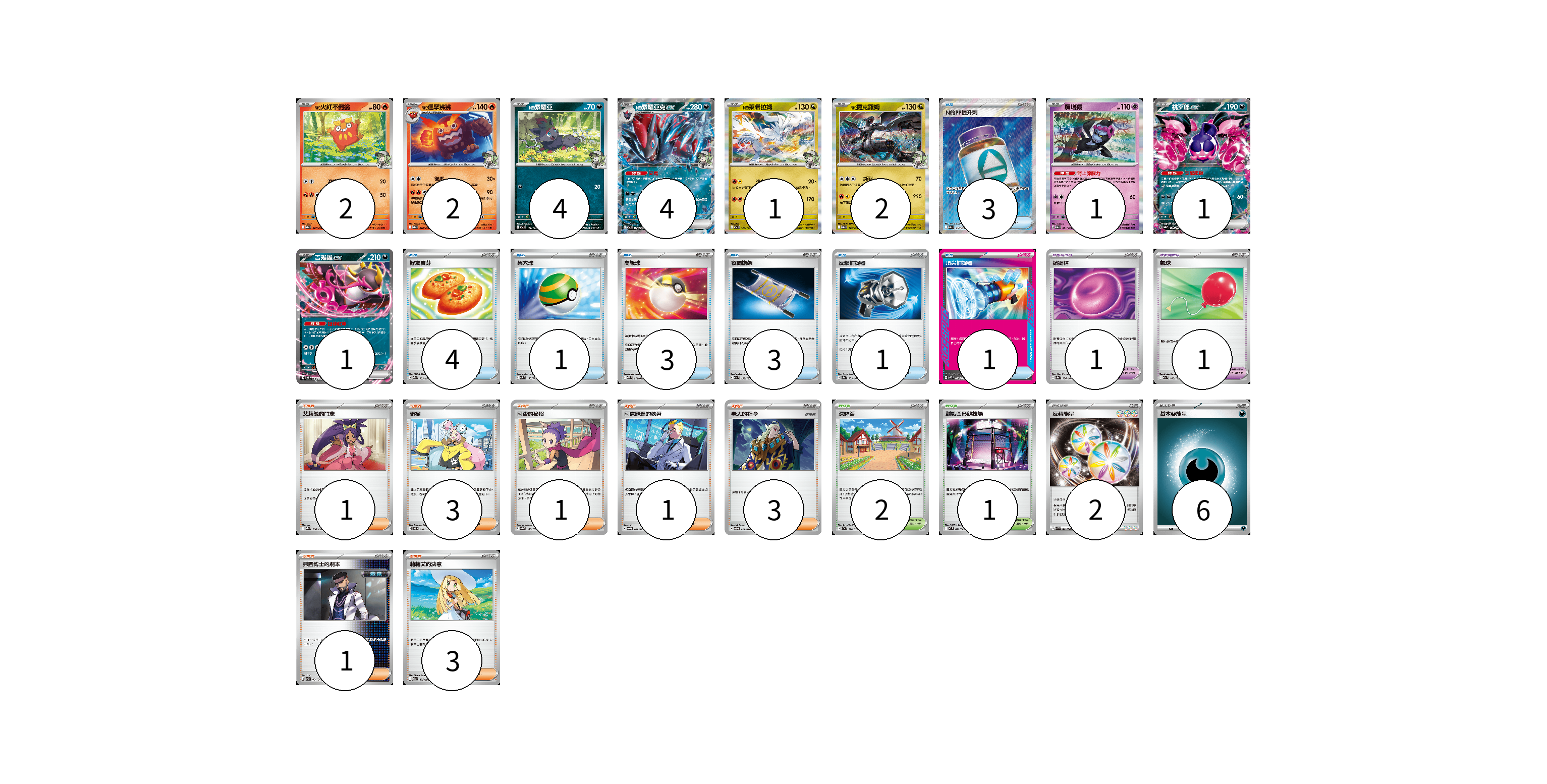 牌組構築方案 以此牌組為基礎新構築牌組 顯示卡面 顯示列表 寶可夢卡(18) 2 2 4 4 1 2 1 1 1 寶可夢道具(2) 1 1 物品卡(16) 3 4 1 3 3 1 1 支援者卡(13) 1 3 1 1 3 1 3 競技場卡(3) 2 1 能量卡(8) 2 6 寶可夢卡(18) 卡牌名稱 張數 卡牌名稱 張數 N的火紅不倒翁 M2a 027/193 02 N的達摩狒狒 M2a 028/193 02 N的索羅亞 M2a 111/193 04 N的索羅亞克ex M2a 112/193 04 N的萊希拉姆 M2a 128/193 01 N的捷克羅姆 M2a 129/193 02 願增猿 M2a 081/193 01 桃歹郎ex SV8a 105/187 01 吉雉雞ex SVOD 004/020 01 寶可夢道具(2) 卡牌名稱 張數 卡牌名稱 張數 鎖鏈糬 SV8a 154/187 01 氣球 M2a 165/193 01 物品卡(16) 卡牌名稱 張數 卡牌名稱 張數 N的PP提升劑 M2a 214/193 03 好友寶芬 M2a 153/193 04 巢穴球 SVM 133/175 01 高級球 MBD 014/022 03 夜間擔架 M2a 159/193 03 反擊捕捉器 SV8a 139/187 01 頂尖捕捉器 MBG 014/022 01 支援者卡(13) 卡牌名稱 張數 卡牌名稱 張數 艾莉絲的鬥志 M2a 168/193 01 奇樹 SVOD 016/020 03 阿杏的秘招 SV8a 166/187 01 阿克羅瑪的執著 SVOM 017/021 01 老大的指令 SVOD 019/020 03 弗圖博士的劇本 SVK 034/042 01 莉莉艾的決意 M2a 175/193 03 競技場卡(3) 卡牌名稱 張數 卡牌名稱 張數 深缽鎮 SV1a 070/073 02 對戰圓形競技場 M2 079/080 01 能量卡(8) 卡牌名稱 張數 卡牌名稱 張數 反轉能量 SVK 041/042 02 基本【惡】能量 MBG DAR 06 以此牌組為基礎新構築牌組 牌組編碼 AGboBO-mnYgSP-PZGxaI copy 列印牌組單 牌組編碼已複製 分享至SNS