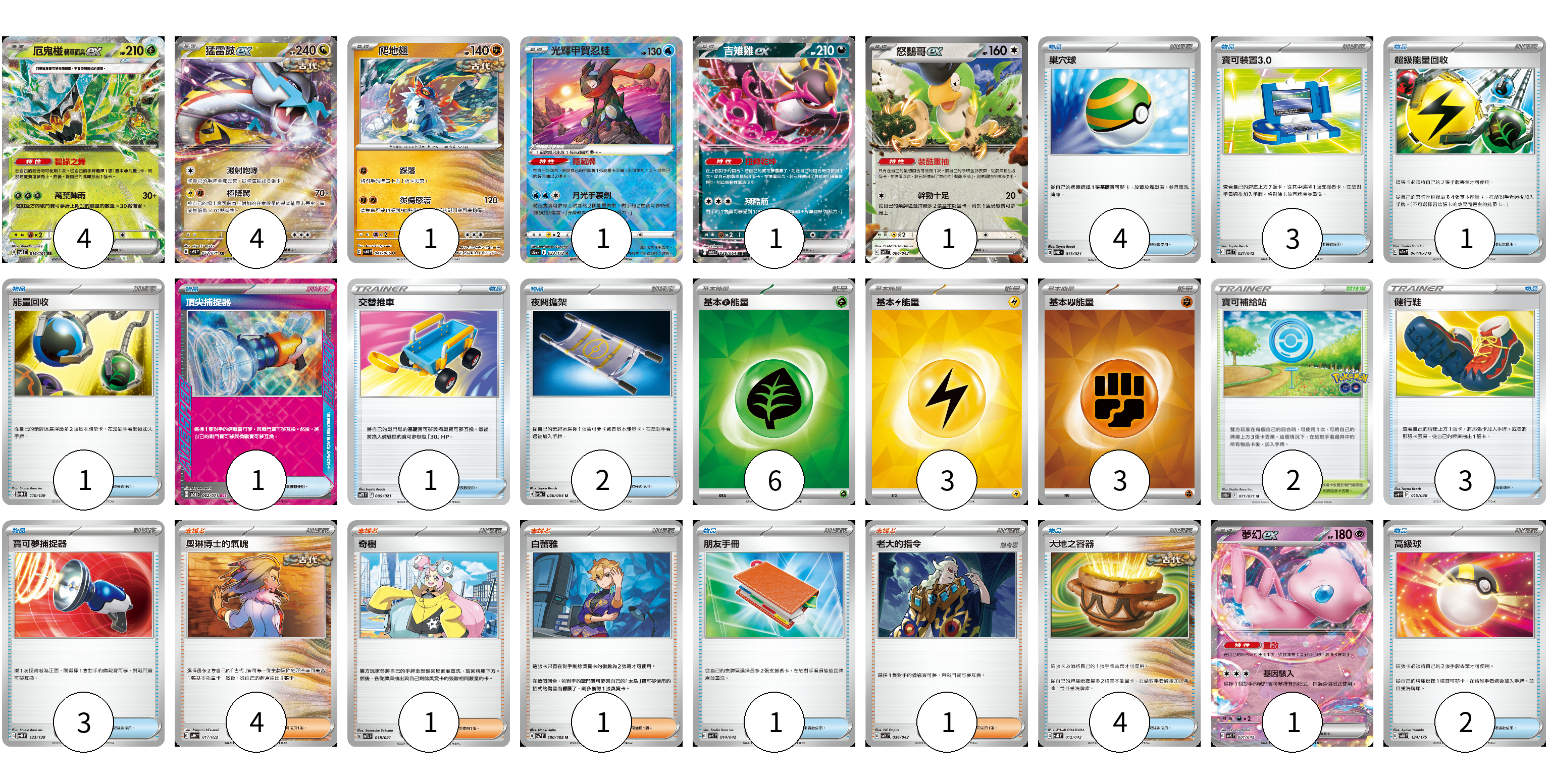 牌組構築方案 以此牌組為基礎新構築牌組 顯示卡面 顯示列表 寶可夢卡(13) 4 4 1 1 1 1 1 寶可夢道具(1) 1 物品卡(26) 4 3 1 1 1 1 2 3 3 1 4 2 支援者卡(6) 4 1 1 競技場卡(2) 2 能量卡(12) 6 3 3 寶可夢卡(13) 卡牌名稱 張數 卡牌名稱 張數 厄鬼椪 碧草面具ex SV6 016/101 04 猛雷鼓ex SV5K 053/071 04 爬地翅 SV4K 041/066 01 光輝甲賀忍蛙 S12a 033/172 01 吉雉雞ex SV6a 038/064 01 怒鸚哥ex SVK 006/042 01 夢幻ex SVK 001/042 01 寶可夢道具(1) 卡牌名稱 張數 卡牌名稱 張數 奇樹 SVTL 018/021 01 物品卡(26) 卡牌名稱 張數 卡牌名稱 張數 巢穴球 SVTR 013/021 04 寶可裝置3.0 SVK 021/042 03 超級能量回收 SV1a 064/073 01 能量回收 SVD 110/139 01 頂尖捕捉器 SV5M 062/071 01 交替推車 SVTR 009/021 01 夜間擔架 SV6a 056/064 02 健行鞋 SVF 015/038 03 寶可夢捕捉器 SVD 123/139 03 朋友手冊 SVK 014/042 01 大地之容器 SVK 012/042 04 高級球 SVM 134/175 02 支援者卡(6) 卡牌名稱 張數 卡牌名稱 張數 奧琳博士的氣魄 SVHK 017/022 04 白蕾雅 SV7 100/102 01 老大的指令 SVK 036/042 01 競技場卡(2) 卡牌名稱 張數 卡牌名稱 張數 寶可補給站 S10b 071/071 02 能量卡(12) 卡牌名稱 張數 卡牌名稱 張數 基本【草】能量 SVK GRA 06 基本【雷】能量 SVK LIG 03 基本【鬥】能量 SVK FIG 03 以此牌組為基礎新構築牌組 牌組編碼 AGdbZQ-cKqIht-gsmSsR copy 列印牌組單 牌組編碼已複製 分享至SNS