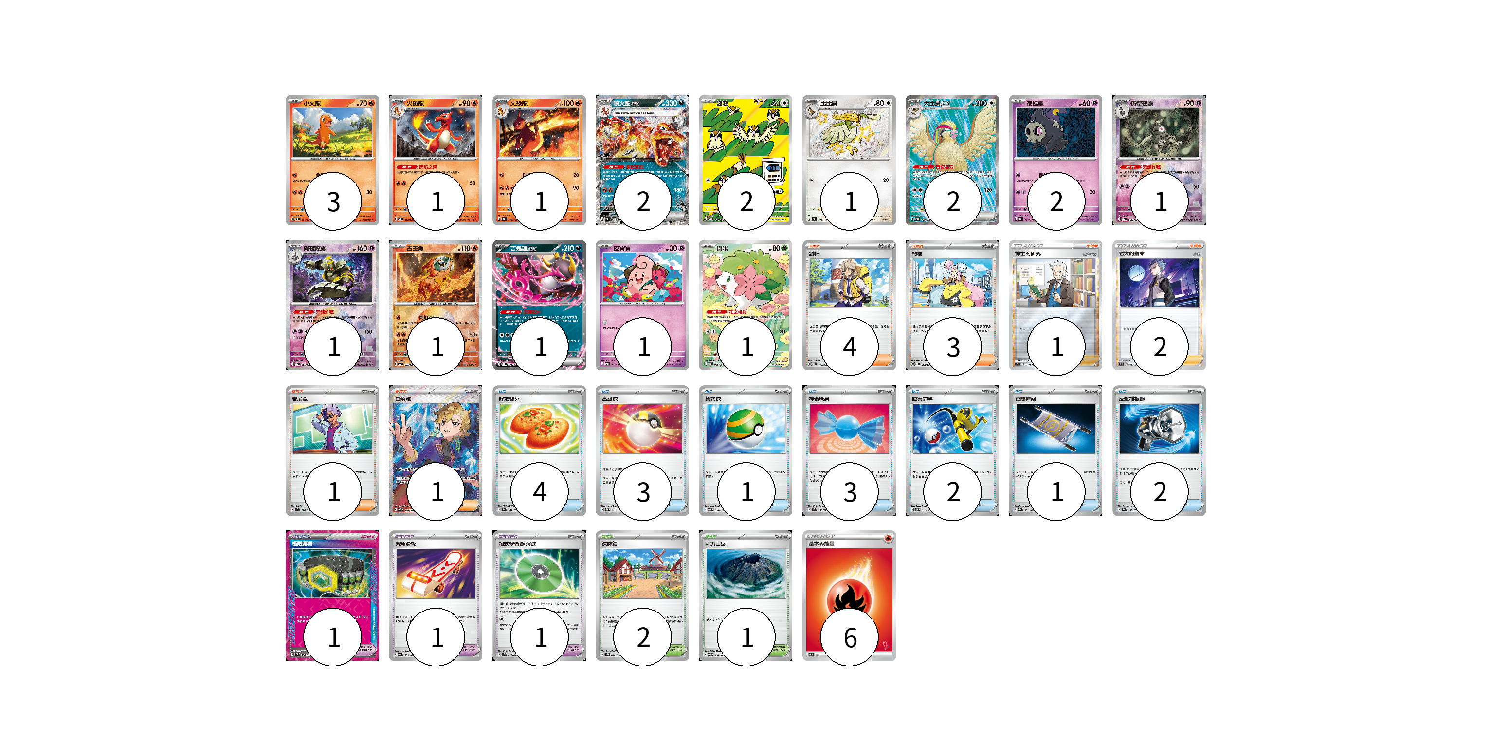 牌組構築方案 以此牌組為基礎新構築牌組 顯示卡面 顯示列表 寶可夢卡(20) 3 1 1 2 2 1 2 2 1 1 1 1 1 1 寶可夢道具(3) 1 1 1 物品卡(16) 4 3 1 3 2 1 2 支援者卡(12) 4 3 1 2 1 1 競技場卡(3) 2 1 能量卡(6) 6 寶可夢卡(20) 卡牌名稱 張數 卡牌名稱 張數 小火龍 SVTL 001/021 03 火恐龍 SVTL 002/021 01 火恐龍 SV2a 005/165 01 噴火龍ex SV4a 115/190 02 波波 SV3 118/108 02 比比鳥 SV4a 305/190 01 大比鳥ex SV3 128/108 02 夜巡靈 SV8a 064/187 02 彷徨夜靈 SV8a 065/187 01 黑夜魔靈 SV8a 066/187 01 古玉魚 SV8a 025/187 01 吉雉雞ex SVOD 004/020 01 皮寶寶 SV3 042/108 01 謝米 SV9a 066/063 01 寶可夢道具(3) 卡牌名稱 張數 卡牌名稱 張數 極限腰帶 SV5K 066/071 01 緊急滑板 SV8a 153/187 01 招式學習器 演進 SVK 025/042 01 物品卡(16) 卡牌名稱 張數 卡牌名稱 張數 好友寶芬 SV8a 147/187 04 高級球 SVTM 012/022 03 巢穴球 SVTH 010/018 01 神奇糖果 SVM 135/175 03 厲害釣竿 SVOM 011/021 02 夜間擔架 SV8a 151/187 01 反擊捕捉器 SV8a 139/187 02 支援者卡(12) 卡牌名稱 張數 卡牌名稱 張數 派帕 SVTM 019/022 04 奇樹 SVOM 018/021 03 博士的研究(山梨博士) SO 026/030 01 老大的指令(赤日) SK 025/030 02 吉尼亞 SV1S 074/078 01 白蕾雅 SV7 126/102 01 競技場卡(3) 卡牌名稱 張數 卡牌名稱 張數 深缽鎮 SVF 036/038 02 引力山岳 SV8 106/106 01 能量卡(6) 卡牌名稱 張數 卡牌名稱 張數 基本火能量 SH FIR 06 以此牌組為基礎新構築牌組 牌組編碼 AHOIqW-MbiacY-IOylsK copy 列印牌組單 牌組編碼已複製 分享至SNS