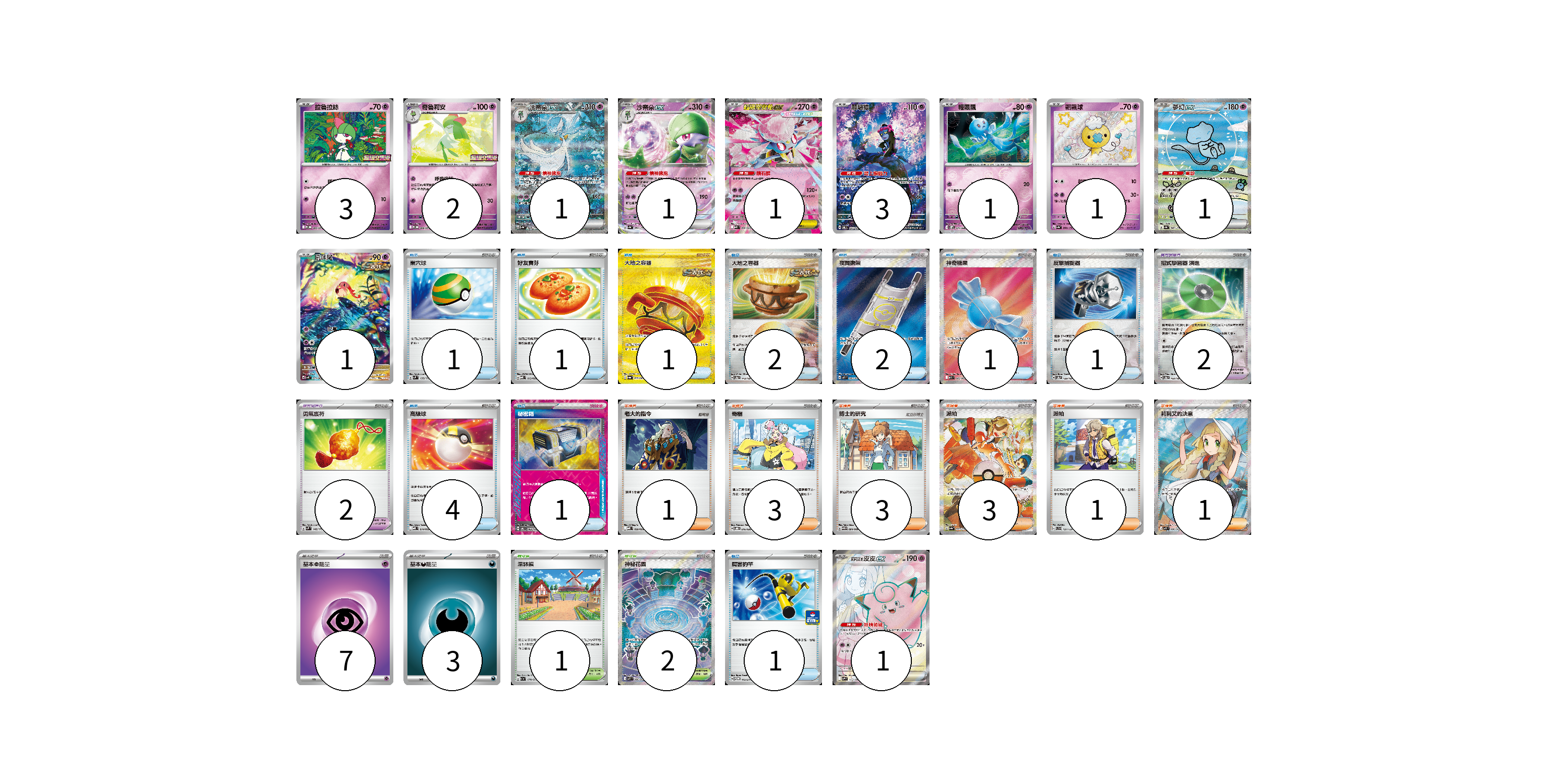 牌組構築方案 以此牌組為基礎新構築牌組 顯示卡面 顯示列表 寶可夢卡(16) 3 2 1 1 1 3 1 1 1 1 1 寶可夢道具(4) 2 2 物品卡(15) 1 1 1 2 2 1 1 4 1 1 支援者卡(12) 1 3 3 3 1 1 競技場卡(3) 1 2 能量卡(10) 7 3 寶可夢卡(16) 卡牌名稱 張數 卡牌名稱 張數 拉魯拉絲 M-P 005/M-P 03 奇魯莉安 M-P 006/M-P 02 沙奈朵ex SV4a 348/190 01 沙奈朵ex SV4a 082/190 01 超級蒂安希ex MBD 006/022 01 願增猿 SV6 107/101 03 輕飄飄 SV11W 041/086 01 飄飄球 SV4a 260/190 01 夢幻ex SV4a 347/190 01 吼叫尾 SV4K 071/066 01 莉莉艾的皮皮ex SV9 115/100 01 寶可夢道具(4) 卡牌名稱 張數 卡牌名稱 張數 招式學習器 演進 SV8a 160/187 02 勇氣護符 SVM 142/175 02 物品卡(15) 卡牌名稱 張數 卡牌名稱 張數 巢穴球 SVM 133/175 01 好友寶芬 MBD 013/022 01 大地之容器 SV6a 093/064 01 大地之容器 SV8a 143/187 02 夜間擔架 M1L 083/063 02 神奇糖果 M1S 082/063 01 反擊捕捉器 SV8a 139/187 01 高級球 MBD 014/022 04 秘密箱 SV6 092/101 01 厲害釣竿 SV-P 112/SV-P 01 支援者卡(12) 卡牌名稱 張數 卡牌名稱 張數 老大的指令 MBD 020/022 01 奇樹 SVOD 016/020 03 博士的研究 SV11B 084/086 03 派帕 SV4a 353/190 03 派帕 SVD 137/139 01 莉莉艾的決意 M1L 086/063 01 競技場卡(3) 卡牌名稱 張數 卡牌名稱 張數 深缽鎮 SV1a 070/073 01 神秘花園 M1S 086/063 02 能量卡(10) 卡牌名稱 張數 卡牌名稱 張數 基本超能量 sv-p PSY 07 基本惡能量 sv-p DAR 03 以此牌組為基礎新構築牌組 牌組編碼 AIUXKo-WiOvtL-MrTpal copy 列印牌組單 牌組編碼已複製 分享至SNS