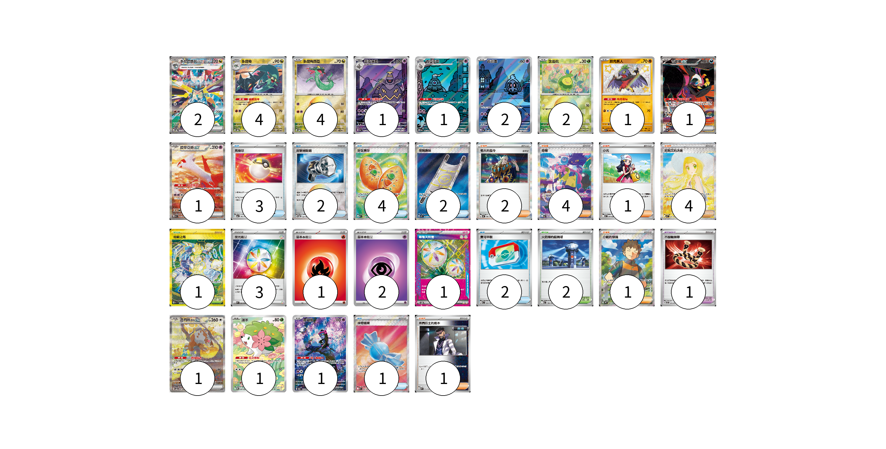 牌組構築方案 以此牌組為基礎新構築牌組 顯示卡面 顯示列表 寶可夢卡(22) 2 4 4 1 1 2 2 1 1 1 1 1 1 寶可夢道具(1) 1 物品卡(14) 3 2 4 2 2 1 支援者卡(13) 2 4 1 4 1 1 競技場卡(3) 1 2 能量卡(7) 3 1 2 1 寶可夢卡(22) 卡牌名稱 張數 卡牌名稱 張數 多龍巴魯托ex SV8a 221/187 02 多龍奇 SV8a 119/187 04 多龍梅西亞 SV8a 118/187 04 黑夜魔靈 SV6a 070/064 01 彷徨夜靈 SV6a 069/064 01 夜巡靈 SV6a 068/064 02 含羞苞 SV8a 001/187 02 摔角鷹人 SV4a 282/190 01 吉雉雞ex SV6a 089/064 01 拉帝亞斯ex SV7a 087/064 01 月月熊 赫月 ex SV5a 091/066 01 謝米 SV9a 066/063 01 願增猿 SV6 107/101 01 寶可夢道具(1) 卡牌名稱 張數 卡牌名稱 張數 不服輸頭帶 SVTL 016/021 01 物品卡(14) 卡牌名稱 張數 卡牌名稱 張數 高級球 SV4a 161/190 03 反擊捕捉器 SV8a 139/187 02 好友寶芬 M1S 081/063 04 夜間擔架 M1L 083/063 02 寶可平板 MC 662/742 02 神奇糖果 M1S 082/063 01 支援者卡(13) 卡牌名稱 張數 卡牌名稱 張數 老大的指令 SV4a 181/190 02 奇樹 SV4a 350/190 04 小光 M2 077/080 01 莉莉艾的決意 M1L 091/063 04 小剛的發掘 SV9 123/100 01 弗圖博士的劇本 SVK 034/042 01 競技場卡(3) 卡牌名稱 張數 卡牌名稱 張數 阻礙之塔 SV10 132/098 01 火箭隊的監視塔 M2a 189/193 02 能量卡(7) 卡牌名稱 張數 卡牌名稱 張數 夜光能量 SVK 042/042 03 基本火能量 sv-p FIR 01 基本超能量 sv-p PSY 02 新衝天能量 SV5K 071/071 01 以此牌組為基礎新構築牌組 牌組編碼 AImmOx-SWtKNZ-yHkDQd copy 列印牌組單 牌組編碼已複製 分享至SNS