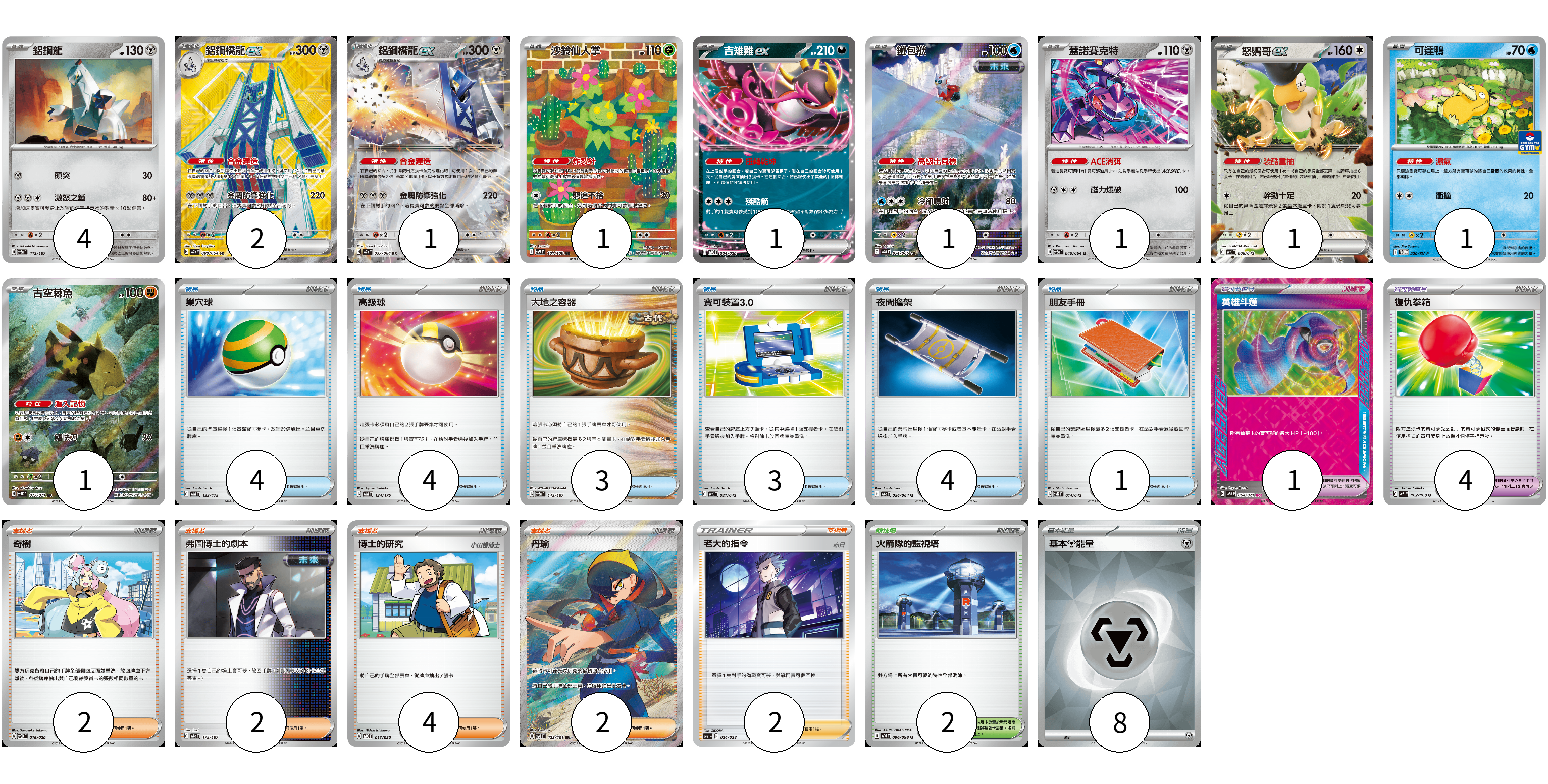 牌組構築方案 以此牌組為基礎新構築牌組 顯示卡面 顯示列表 寶可夢卡(14) 4 2 1 1 1 1 1 1 1 1 寶可夢道具(5) 1 4 物品卡(19) 4 4 3 3 4 1 支援者卡(12) 2 2 4 2 2 競技場卡(2) 2 能量卡(8) 8 寶可夢卡(14) 卡牌名稱 張數 卡牌名稱 張數 鋁鋼龍 SV8a 112/187 04 鋁鋼橋龍ex SV7a 080/064 02 鋁鋼橋龍ex SV7a 037/064 01 沙鈴仙人掌 SV9 101/100 01 吉雉雞ex SVOD 004/020 01 鐵包袱 SV4M 071/066 01 蓋諾賽克特 SV6a 040/064 01 怒鸚哥ex SVK 006/042 01 可達鴨 SV-P 220/SV-P 01 古空棘魚 SV5K 077/071 01 寶可夢道具(5) 卡牌名稱 張數 卡牌名稱 張數 英雄斗篷 SV5M 064/071 01 復仇拳箱 SV3 102/108 04 物品卡(19) 卡牌名稱 張數 卡牌名稱 張數 巢穴球 SVM 133/175 04 高級球 SVM 134/175 04 大地之容器 SV8a 143/187 03 寶可裝置3.0 SVK 021/042 03 夜間擔架 SV6a 056/064 04 朋友手冊 SVK 014/042 01 支援者卡(12) 卡牌名稱 張數 卡牌名稱 張數 奇樹 SVOD 016/020 02 弗圖博士的劇本 SV8a 175/187 02 博士的研究 SVOD 017/020 04 丹瑜 SV6 123/101 02 老大的指令(赤日) SVB 024/028 02 競技場卡(2) 卡牌名稱 張數 卡牌名稱 張數 火箭隊的監視塔 SV10 096/098 02 能量卡(8) 卡牌名稱 張數 卡牌名稱 張數 基本【鋼】能量 SVM MET 08 以此牌組為基礎新構築牌組 牌組編碼 ALJMuj-vYnrbq-CbwIkd copy 列印牌組單 牌組編碼已複製 分享至SNS