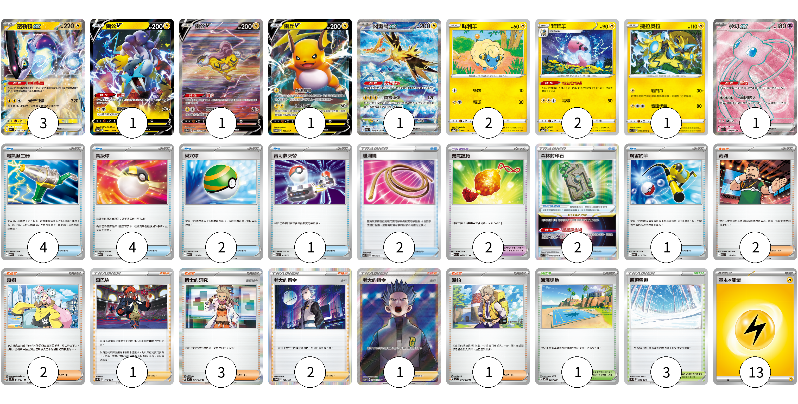 牌組構築方案 以此牌組為基礎新構築牌組 顯示卡面 顯示列表 寶可夢卡(13) 3 1 1 1 1 2 2 1 1 寶可夢道具(4) 2 2 物品卡(14) 4 4 2 1 2 1 支援者卡(12) 2 2 1 3 2 1 1 競技場卡(4) 1 3 能量卡(13) 13 寶可夢卡(13) 卡牌名稱 張數 卡牌名稱 張數 密勒頓ex SV1V 037/078 03 雷公V S12a 038/172 01 雷公V S12a 218/172 01 雷丘V S-P 139/S-P 01 閃電鳥ex SV2a 204/165 01 咩利羊 S12a 036/172 02 茸茸羊 S12a 037/172 02 捷拉奧拉 S12 032/098 01 夢幻ex SV2a 195/165 01 寶可夢道具(4) 卡牌名稱 張數 卡牌名稱 張數 勇氣護符 SV2D 067/071 02 森林封印石 S12 092/098 02 物品卡(14) 卡牌名稱 張數 卡牌名稱 張數 電氣發生器 SVD 113/139 04 高級球 SVD 119/139 04 巢穴球 SVD 118/139 02 寶可夢交替 SVAL 016/021 01 離洞繩 SCB 117/156 02 厲害釣竿 SVF 013/038 01 支援者卡(12) 卡牌名稱 張數 卡牌名稱 張數 裁判 SVD 130/139 02 奇樹 SV2D 069/071 02 奇巴納 SVB 018/028 01 博士的研究(奧琳博士) SV1S 076/078 03 老大的指令(赤日) S12a 161/172 02 老大的指令(赤日) S12a 250/172 01 派帕 SV1V 076/078 01 競技場卡(4) 卡牌名稱 張數 卡牌名稱 張數 海灘場地 SVF 035/038 01 通頂雪道 SVB 026/028 03 能量卡(13) 卡牌名稱 張數 卡牌名稱 張數 基本【雷】能量 SVF LIG 13 以此牌組為基礎新構築牌組 牌組編碼 ANEymc-HinXvQ-dZTKgd copy 列印牌組單 牌組編碼已複製 分享至SNS