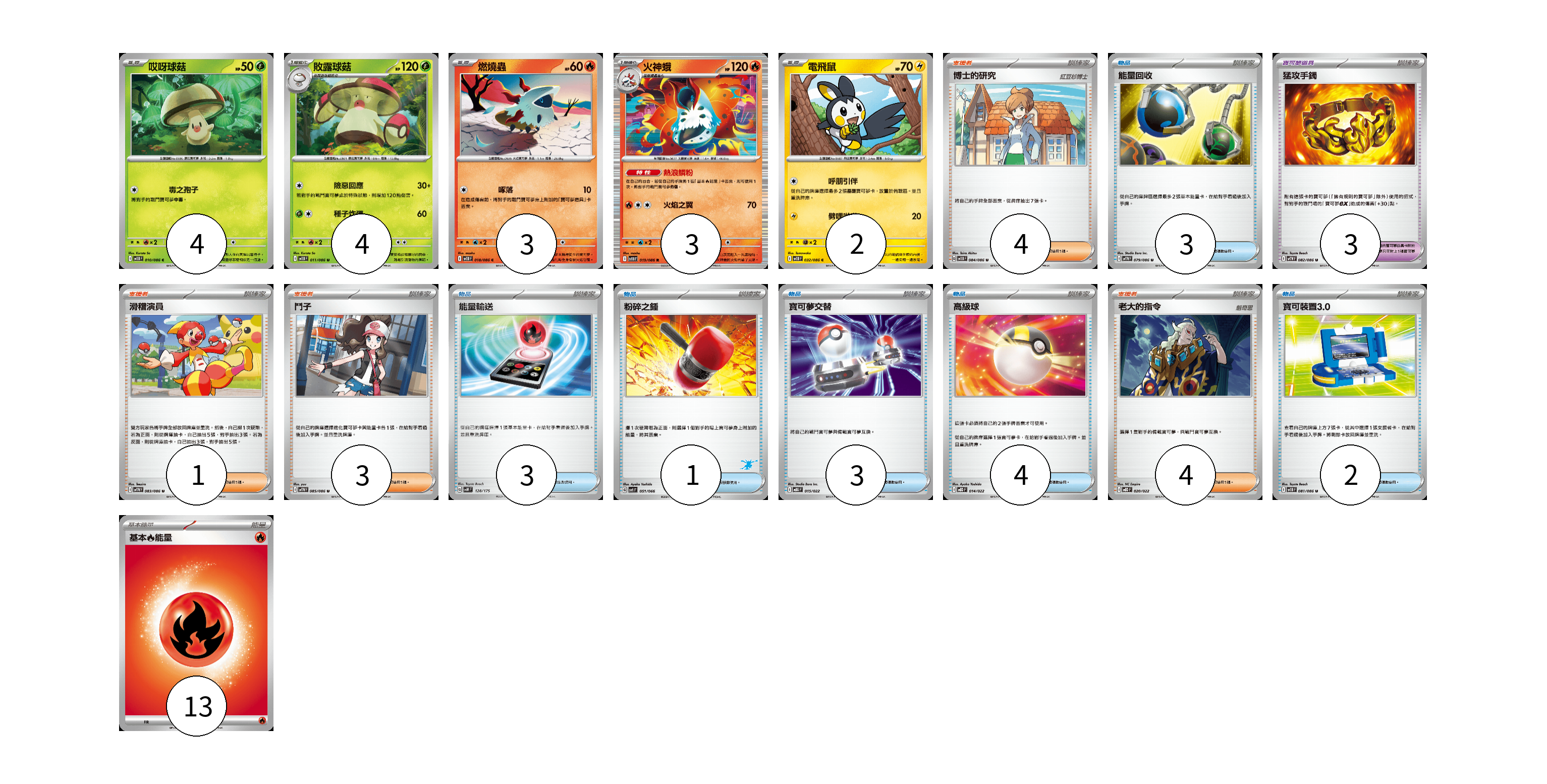 牌組構築方案 以此牌組為基礎新構築牌組 顯示卡面 顯示列表 寶可夢卡(16) 4 4 3 3 2 寶可夢道具(3) 3 物品卡(16) 3 3 1 3 4 2 支援者卡(12) 4 1 3 4 能量卡(13) 13 寶可夢卡(16) 卡牌名稱 張數 卡牌名稱 張數 哎呀球菇 SV11B 010/086 04 敗露球菇 SV11B 011/086 04 燃燒蟲 SV11B 018/086 03 火神蛾 SV11B 019/086 03 電飛鼠 SV11B 032/086 02 寶可夢道具(3) 卡牌名稱 張數 卡牌名稱 張數 猛攻手鐲 SV11W 082/086 03 物品卡(16) 卡牌名稱 張數 卡牌名稱 張數 能量回收 SV11W 079/086 03 能量輸送 SVM 128/175 03 粉碎之錘 SVI 051/066 01 寶可夢交替 MBG 015/022 03 高級球 MBD 014/022 04 寶可裝置3.0 SV11B 081/086 02 支援者卡(12) 卡牌名稱 張數 卡牌名稱 張數 博士的研究 SV11B 084/086 04 滑稽演員 SV11W 083/086 01 鬥子 SV11W 085/086 03 老大的指令 MBD 020/022 04 能量卡(13) 卡牌名稱 張數 卡牌名稱 張數 基本【火】能量 M-P FIR 13 以此牌組為基礎新構築牌組 牌組編碼 ANUYec-ezTqvZ-ssMjIf copy 列印牌組單 牌組編碼已複製 分享至SNS