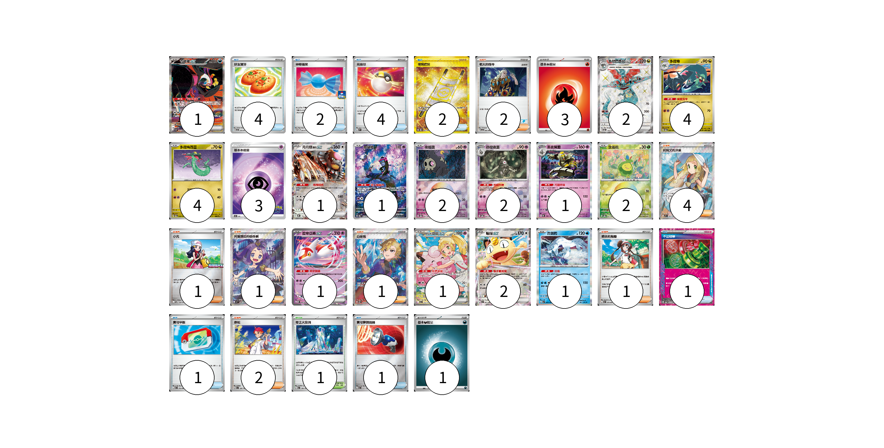 牌組構築方案 以此牌組為基礎新構築牌組 顯示卡面 顯示列表 寶可夢卡(25) 1 2 4 4 1 1 2 2 1 2 1 1 2 1 物品卡(15) 4 2 4 2 1 1 1 支援者卡(12) 2 4 1 1 1 1 2 競技場卡(1) 1 能量卡(7) 3 3 1 寶可夢卡(25) 卡牌名稱 張數 卡牌名稱 張數 吉雉雞ex SV6a 089/064 01 多龍巴魯托ex SV6 120/101 02 多龍奇 SV6 080/101 04 多龍梅西亞 SV6 079/101 04 月月熊 赫月ex SV8a 134/187 01 願增猿 SV6 107/101 01 夜巡靈 SV8a 064/187 02 彷徨夜靈 SV8a 065/187 02 黑夜魔靈 SV8a 066/187 01 含羞苞 SV8a 001/187 02 拉帝亞斯ex MBD 003/022 01 莉莉艾的皮皮ex MC 765/742 01 喵喵ex M3 061/080 02 古劍豹 M2a 043/193 01 物品卡(15) 卡牌名稱 張數 卡牌名稱 張數 好友寶芬 SVTL 010/021 04 神奇糖果 SV-P 104/SV-P 02 高級球 SVK 018/042 04 夜間擔架 SV8 137/106 02 不公印章 SV5a 053/066 01 寶可平板 M3 070/080 01 寶可夢捕捉器 MC 665/742 01 支援者卡(12) 卡牌名稱 張數 卡牌名稱 張數 老大的指令 SVI 066/066 02 莉莉艾的決意 M1L 086/063 04 小光 M-P 028/M-P 01 阿塞蘿拉的惡作劇 M1S 084/063 01 白蕾雅 SV7 126/102 01 鳴依的勉勵 M3 075/080 01 赤松 MC 696/742 02 競技場卡(1) 卡牌名稱 張數 卡牌名稱 張數 零之大空洞 M2a 184/193 01 能量卡(7) 卡牌名稱 張數 卡牌名稱 張數 基本【火】能量 SVF FIR 03 基本超能量 S10b PSY 03 基本【惡】能量 MC DAR 01 以此牌組為基礎新構築牌組 牌組編碼 ARcBiz-EpctOi-VjTNRb copy 列印牌組單 牌組編碼已複製 分享至SNS