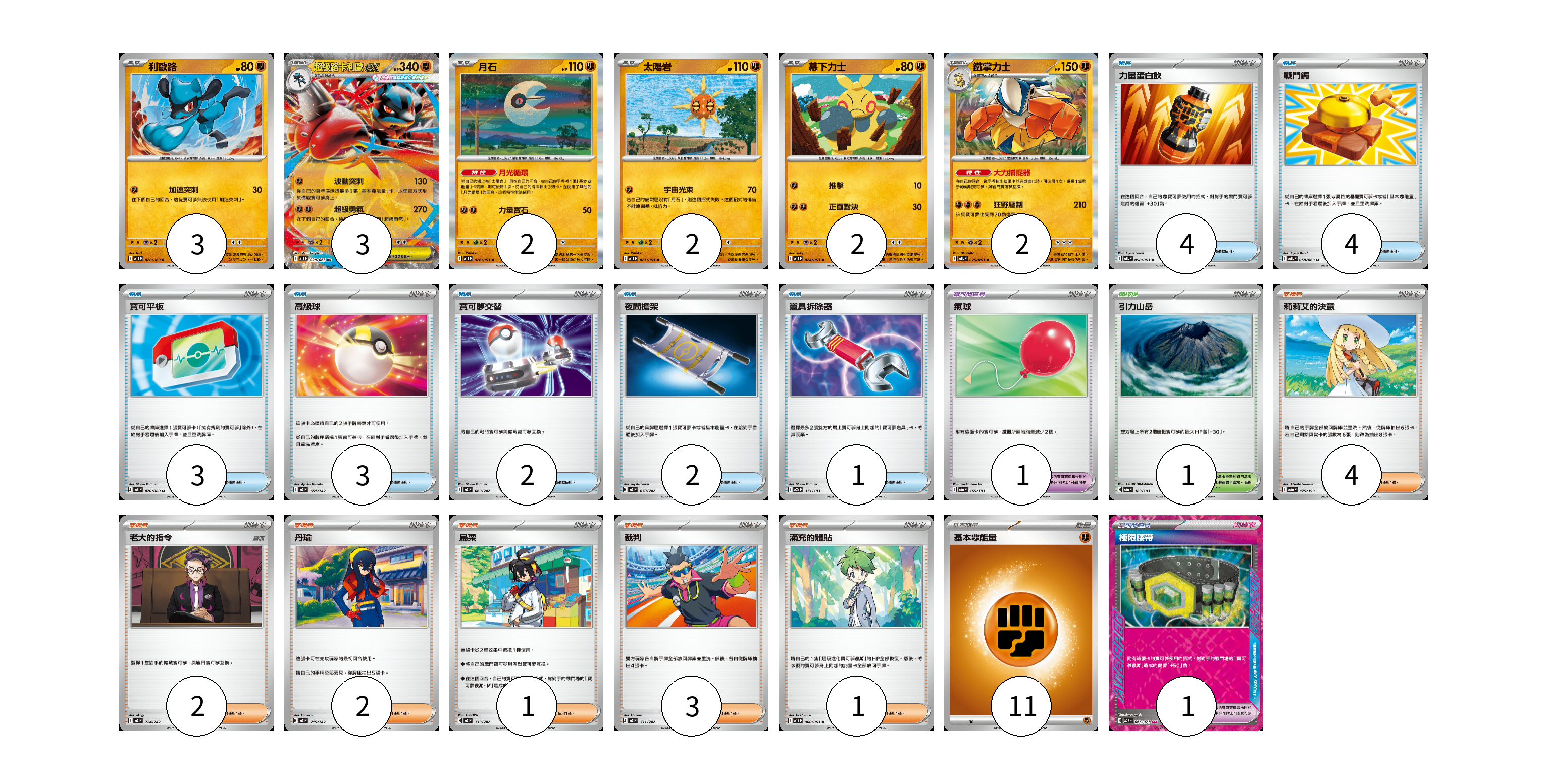 牌組構築方案 以此牌組為基礎新構築牌組 顯示卡面 顯示列表 寶可夢卡(14) 3 3 2 2 2 2 寶可夢道具(2) 1 1 物品卡(19) 4 4 3 3 2 2 1 支援者卡(13) 4 2 2 1 3 1 競技場卡(1) 1 能量卡(11) 11 寶可夢卡(14) 卡牌名稱 張數 卡牌名稱 張數 利歐路 M1L 028/063 03 超級路卡利歐ex M1L 029/063 03 月石 M1L 026/063 02 太陽岩 M1L 027/063 02 幕下力士 M1L 024/063 02 鐵掌力士 M1L 025/063 02 寶可夢道具(2) 卡牌名稱 張數 卡牌名稱 張數 氣球 M2a 165/193 01 極限腰帶 SV5K 066/071 01 物品卡(19) 卡牌名稱 張數 卡牌名稱 張數 力量蛋白飲 M1L 058/063 04 戰鬥鑼 M1L 059/063 04 寶可平板 M3 070/080 03 高級球 MC 651/742 03 寶可夢交替 MC 663/742 02 夜間擔架 MC 670/742 02 道具拆除器 M2a 151/193 01 支援者卡(13) 卡牌名稱 張數 卡牌名稱 張數 莉莉艾的決意 M2a 175/193 04 老大的指令 MC 724/742 02 丹瑜 MC 715/742 02 烏栗 MC 713/742 01 裁判 MC 711/742 03 滿充的體貼 M1S 060/063 01 競技場卡(1) 卡牌名稱 張數 卡牌名稱 張數 引力山岳 M2a 183/193 01 能量卡(11) 卡牌名稱 張數 卡牌名稱 張數 基本【鬥】能量 MC FIG 11 以此牌組為基礎新構築牌組 牌組編碼 ATFlBA-Aomnww-koAqQV copy 列印牌組單 牌組編碼已複製 分享至SNS