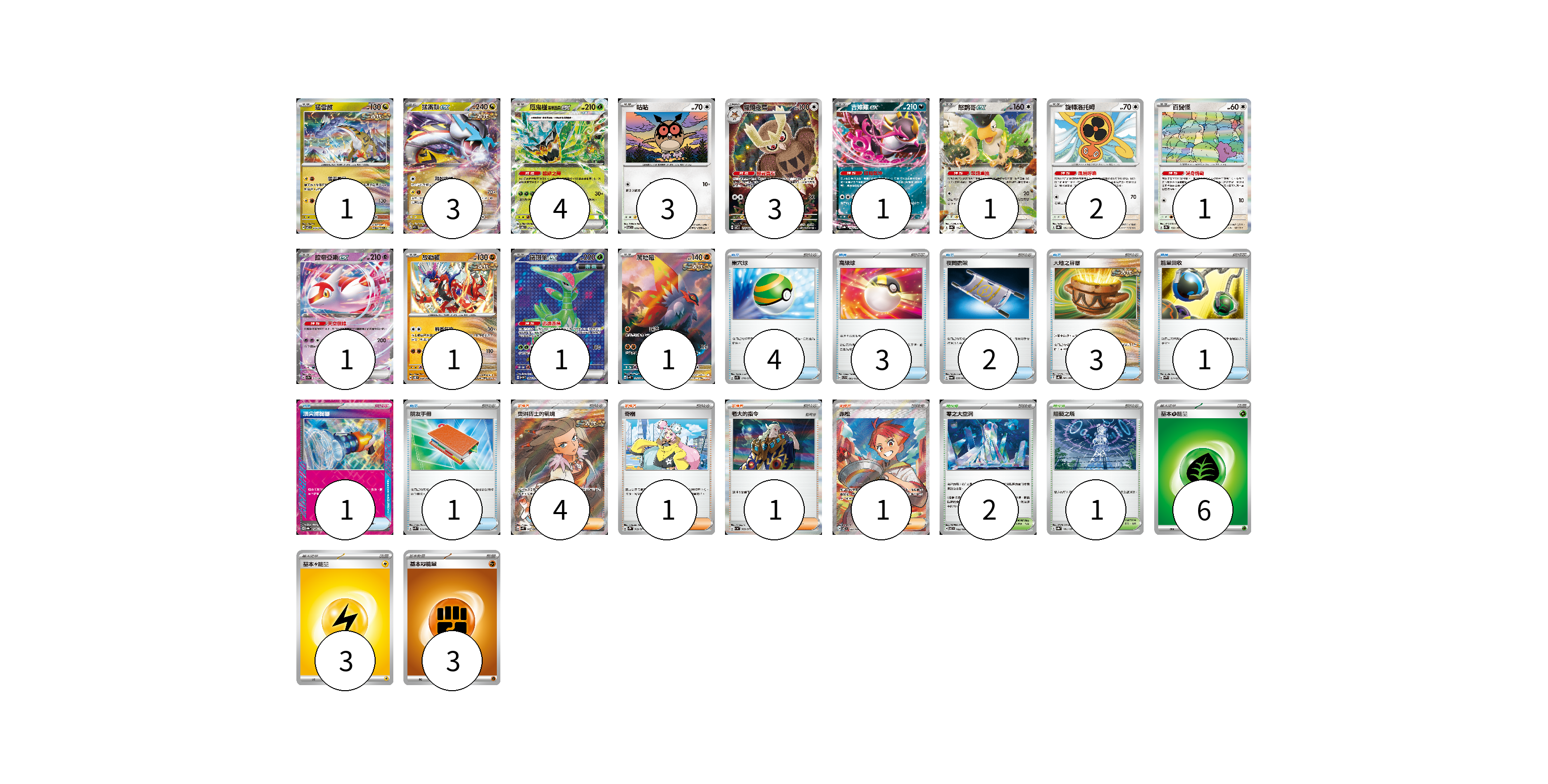 牌組構築方案 以此牌組為基礎新構築牌組 顯示卡面 顯示列表 寶可夢卡(23) 1 3 4 3 3 1 1 2 1 1 1 1 1 物品卡(15) 4 3 2 3 1 1 1 支援者卡(7) 4 1 1 1 競技場卡(3) 2 1 能量卡(12) 6 3 3 寶可夢卡(23) 卡牌名稱 張數 卡牌名稱 張數 猛雷鼓 SV7 075/102 01 猛雷鼓ex SV5K 053/071 03 厄鬼椪 碧草面具ex SV6 016/101 04 咕咕 SV7 076/102 03 貓頭夜鷹 SV7 114/102 03 吉雉雞ex SV8a 104/187 01 怒鸚哥ex SV4a 154/190 01 旋轉洛托姆 SV8a 131/187 02 百變怪 SV2a 132/165 01 拉帝亞斯ex SV7a 019/064 01 故勒頓 SV8 069/106 01 鐵斑葉ex SV5M 084/071 01 爬地翅 SV4K 074/066 01 物品卡(15) 卡牌名稱 張數 卡牌名稱 張數 巢穴球 SV1S 070/078 04 高級球 SVB 002/028 03 夜間擔架 SV6a 056/064 02 大地之容器 SV4K 060/066 03 能量回收 SVAW 011/023 01 頂尖捕捉器 SV8a 148/187 01 朋友手冊 SVK 014/042 01 支援者卡(7) 卡牌名稱 張數 卡牌名稱 張數 奧琳博士的氣魄 SV4K 085/066 04 奇樹 SV2D 069/071 01 老大的指令 SV1a 069/073 01 赤松 SV7 123/102 01 競技場卡(3) 卡牌名稱 張數 卡牌名稱 張數 零之大空洞 SV7 102/102 02 阻礙之塔 SV8a 181/187 01 能量卡(12) 卡牌名稱 張數 卡牌名稱 張數 基本草能量 sv-p GRA 06 基本雷能量 sv-p LIG 03 基本【鬥】能量 SVAM FIG 03 以此牌組為基礎新構築牌組 牌組編碼 AUdJHa-grHxJG-vEdNip copy 列印牌組單 牌組編碼已複製 分享至SNS
