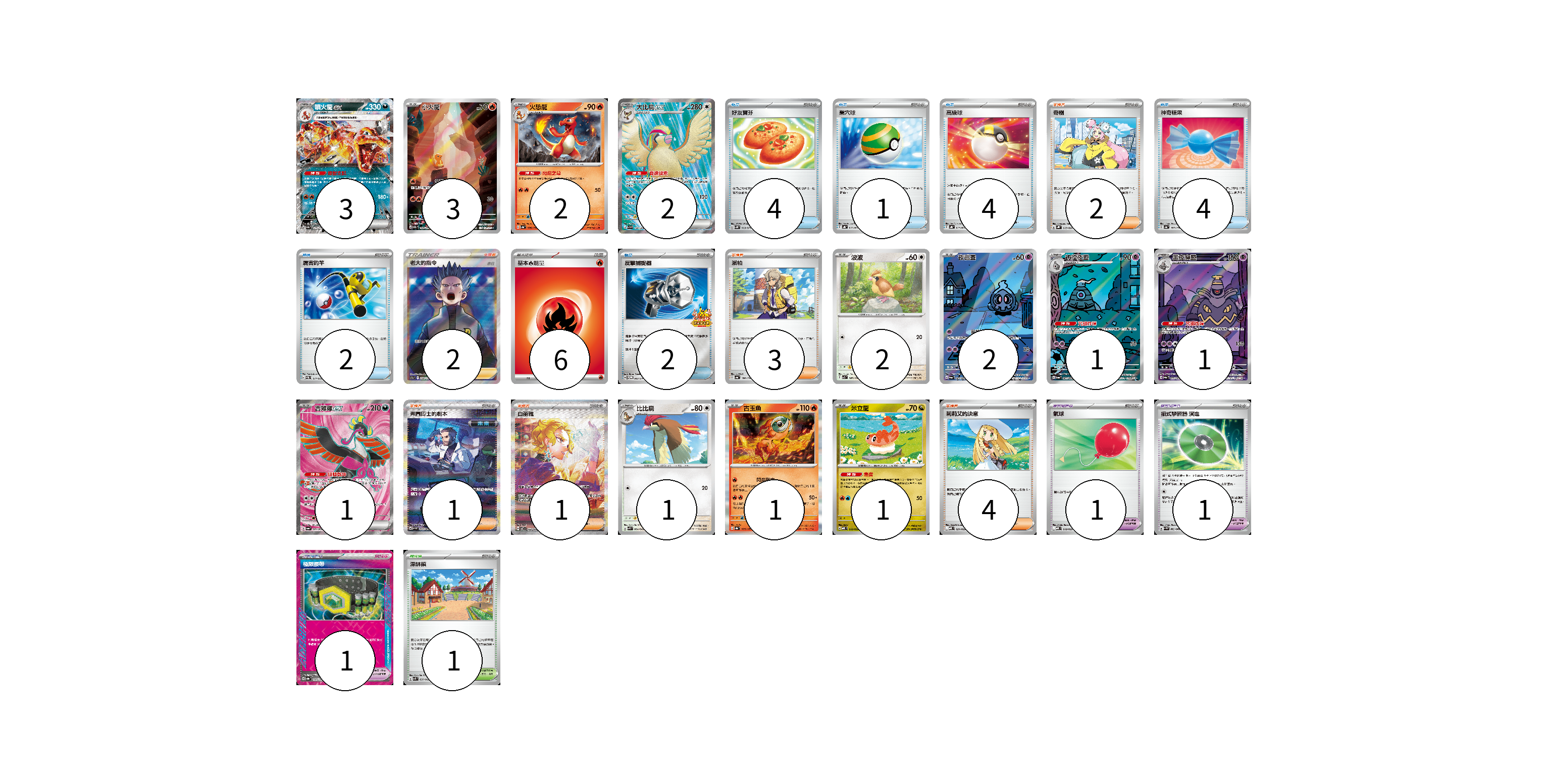 牌組構築方案 以此牌組為基礎新構築牌組 顯示卡面 顯示列表 寶可夢卡(20) 3 3 2 2 2 2 1 1 1 1 1 1 寶可夢道具(3) 1 1 1 物品卡(17) 4 1 4 4 2 2 支援者卡(13) 2 2 3 1 1 4 競技場卡(1) 1 能量卡(6) 6 寶可夢卡(20) 卡牌名稱 張數 卡牌名稱 張數 噴火龍ex SV4a 115/190 03 小火龍 SV2a 168/165 03 火恐龍 SV4a 026/190 02 大比鳥ex SV3 128/108 02 波波 SV3 087/108 02 夜巡靈 SV6a 068/064 02 彷徨夜靈 SV6a 069/064 01 黑夜魔靈 SV6a 070/064 01 吉雉雞ex SV6a 081/064 01 比比鳥 SVK 004/042 01 古玉魚 SV8a 025/187 01 米立龍 MBD 010/022 01 寶可夢道具(3) 卡牌名稱 張數 卡牌名稱 張數 氣球 MBD 018/022 01 招式學習器 演進 SV4M 063/066 01 極限腰帶 SV8a 159/187 01 物品卡(17) 卡牌名稱 張數 卡牌名稱 張數 好友寶芬 SV5K 063/071 04 巢穴球 SVHK 012/022 01 高級球 SVHK 013/022 04 神奇糖果 SV4a 163/190 04 厲害釣竿 SVEM 011/020 02 反擊捕捉器 SV-P 083/SV-P 02 支援者卡(13) 卡牌名稱 張數 卡牌名稱 張數 奇樹 SVHK 019/022 02 老大的指令(赤日) S12a 250/172 02 派帕 SV4a 180/190 03 弗圖博士的劇本 SV4M 091/066 01 白蕾雅 SV7 132/102 01 莉莉艾的決意 MBD 021/022 04 競技場卡(1) 卡牌名稱 張數 卡牌名稱 張數 深缽鎮 SVK 039/042 01 能量卡(6) 卡牌名稱 張數 卡牌名稱 張數 基本【火】能量 SVHK FIR 06 以此牌組為基礎新構築牌組 牌組編碼 AVVDsM-BkDwmD-PFsFKS copy 列印牌組單 牌組編碼已複製 分享至SNS