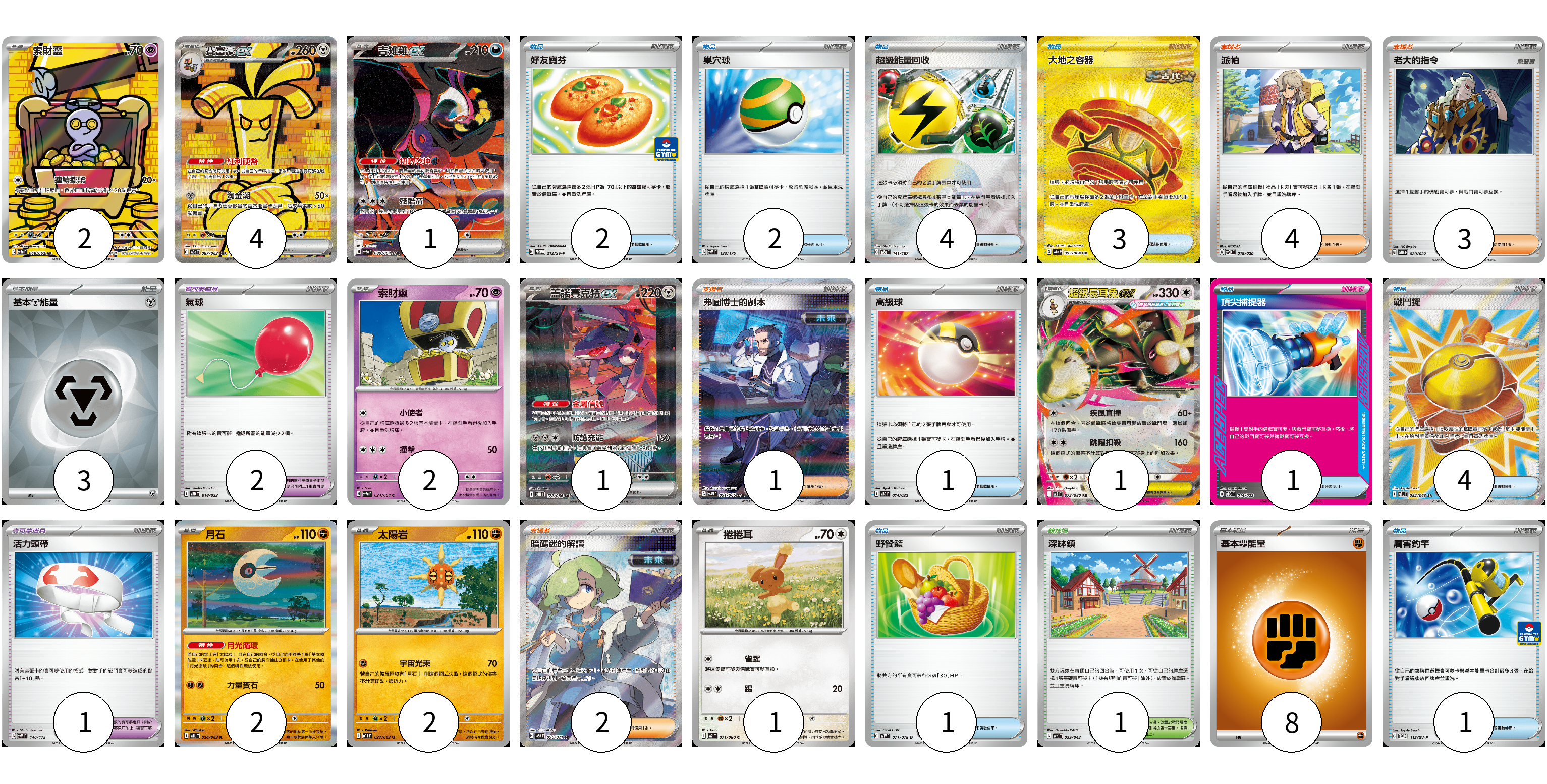 牌組構築方案 以此牌組為基礎新構築牌組 顯示卡面 顯示列表 寶可夢卡(16) 2 4 1 2 1 1 2 2 1 寶可夢道具(3) 2 1 物品卡(19) 2 2 4 3 1 1 4 1 1 支援者卡(10) 4 3 1 2 競技場卡(1) 1 能量卡(11) 3 8 寶可夢卡(16) 卡牌名稱 張數 卡牌名稱 張數 索財靈 SV3a 068/062 02 賽富豪ex SV3a 087/062 04 吉雉雞ex SV6a 089/064 01 索財靈 SV7a 024/064 02 蓋諾賽克特ex SV11B 172/086 01 超級長耳兔ex M2 072/080 01 月石 M1L 026/063 02 太陽岩 M1L 027/063 02 捲捲耳 M2 071/080 01 寶可夢道具(3) 卡牌名稱 張數 卡牌名稱 張數 氣球 MBD 018/022 02 活力頭帶 SVM 140/175 01 物品卡(19) 卡牌名稱 張數 卡牌名稱 張數 好友寶芬 SV-P 212/SV-P 02 巢穴球 SVM 133/175 02 超級能量回收 SV8a 141/187 04 大地之容器 SV6a 093/064 03 高級球 MBD 014/022 01 頂尖捕捉器 MBG 014/022 01 戰鬥鑼 M1L 082/063 04 野餐籃 SV1V 071/078 01 厲害釣竿 SV-P 112/SV-P 01 支援者卡(10) 卡牌名稱 張數 卡牌名稱 張數 派帕 SVOD 018/020 04 老大的指令 SVTM 020/022 03 弗圖博士的劇本 SV4M 091/066 01 暗碼迷的解讀 SV5M 090/071 02 競技場卡(1) 卡牌名稱 張數 卡牌名稱 張數 深缽鎮 SVK 039/042 01 能量卡(11) 卡牌名稱 張數 卡牌名稱 張數 基本【鋼】能量 SVOD MET 03 基本【鬥】能量 M-P FIG 08 以此牌組為基礎新構築牌組 牌組編碼 AVZDUZ-JfEnVg-QEhXIg copy 列印牌組單 牌組編碼已複製 分享至SNS